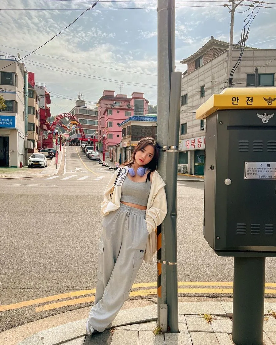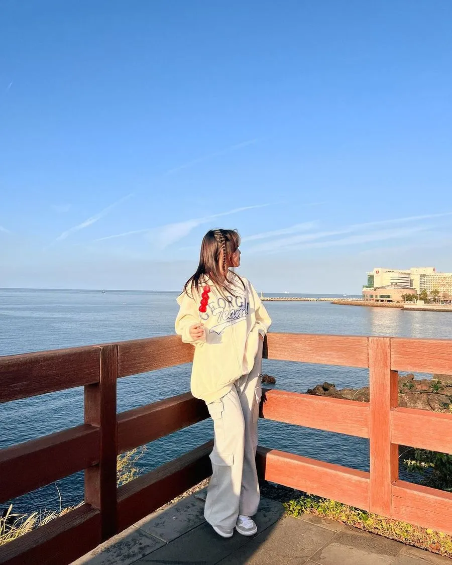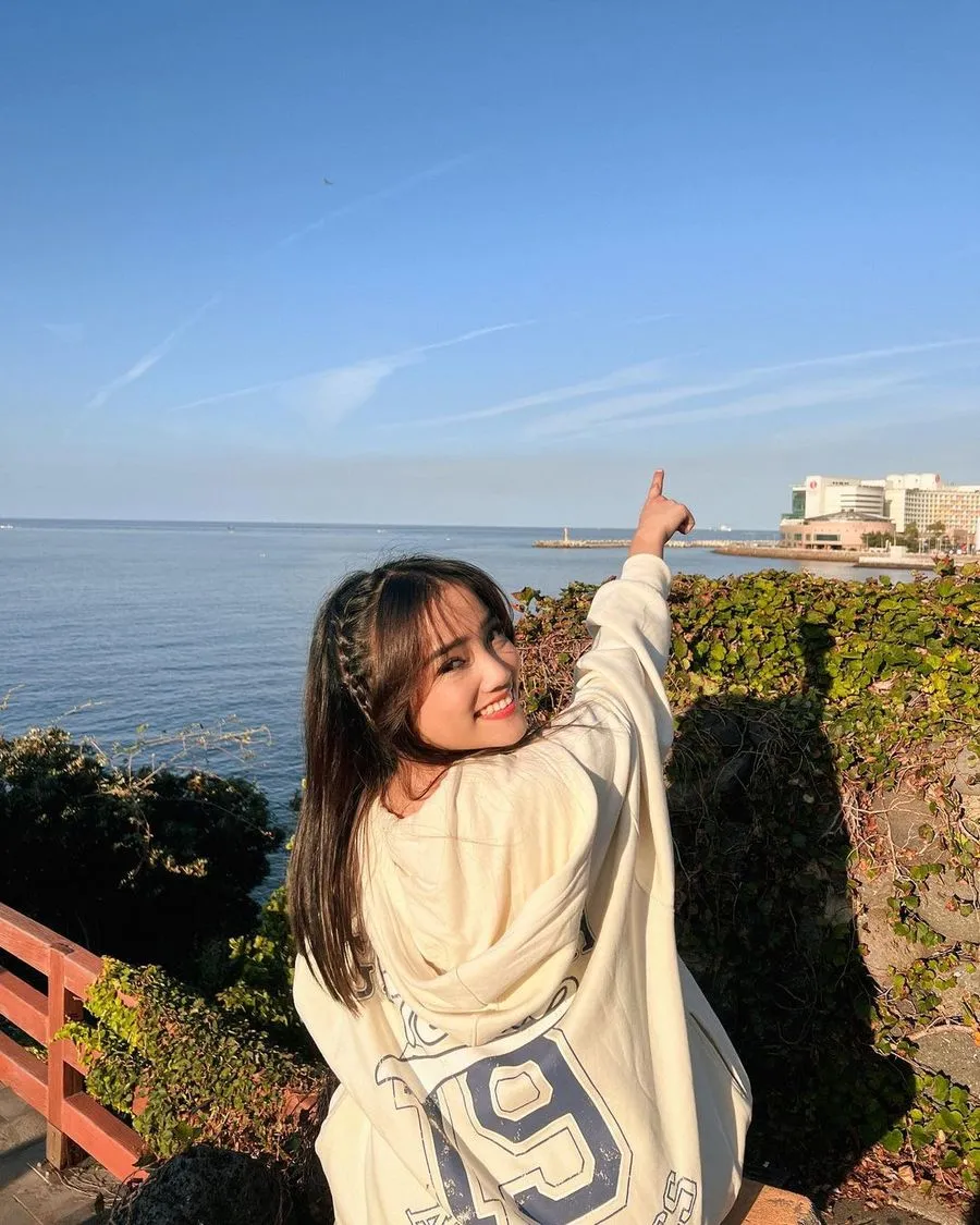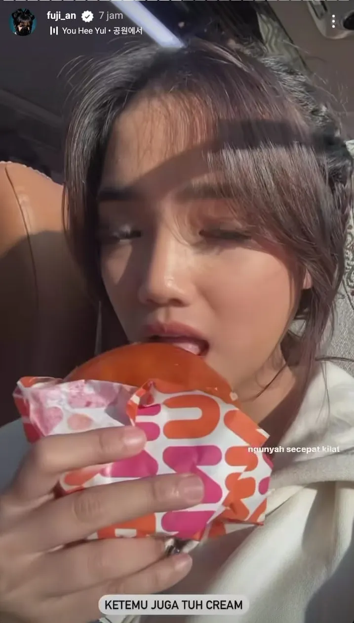 Namun rupanya, donat itu sempat viral di Korea Selatan. Selain makan donat, Fuji juga menikmati pemandangan laut. Gayanya masih tetap simple.