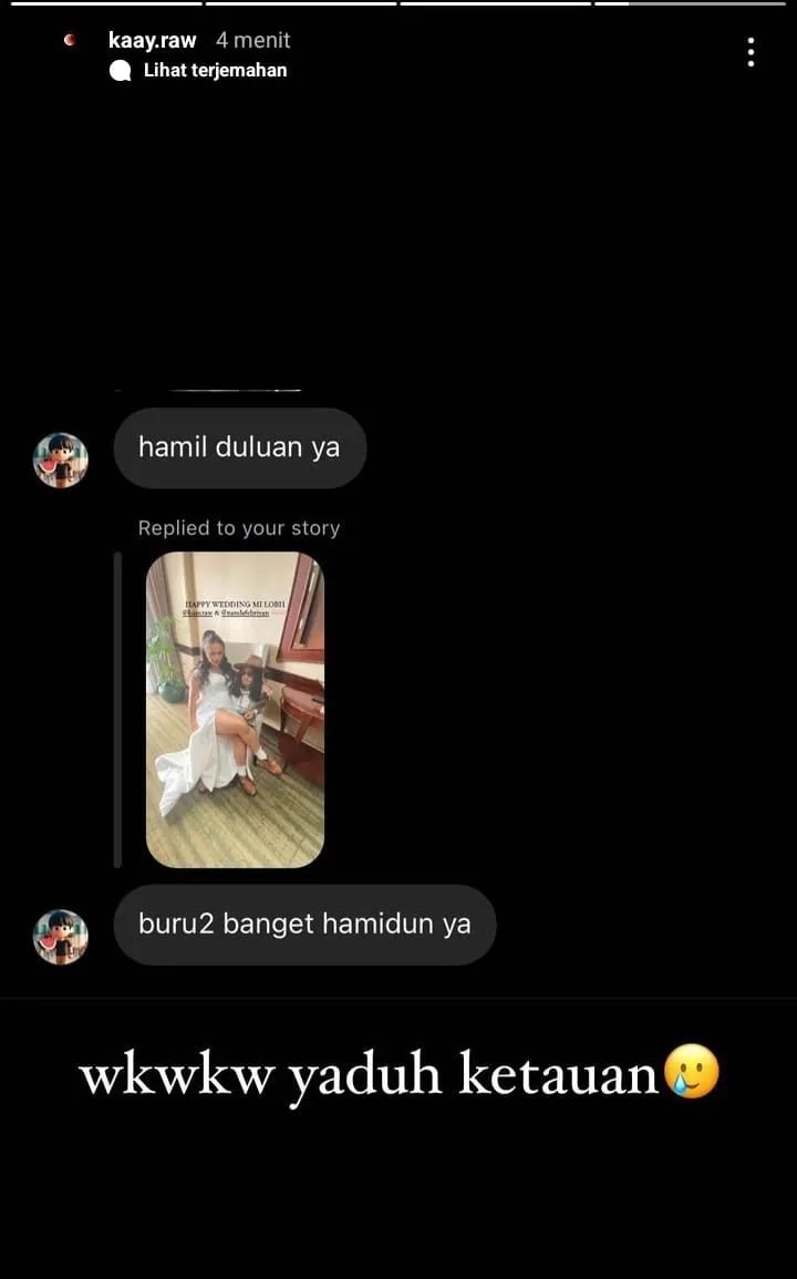 Sementara itu, ada juga yang terang-terangan menuding Kay hamil duluan. Kay pun tak tinggal diam, ia segera merespon tudingan itu dengan kalimat, "Wkwkw yaduh ketahuan."
