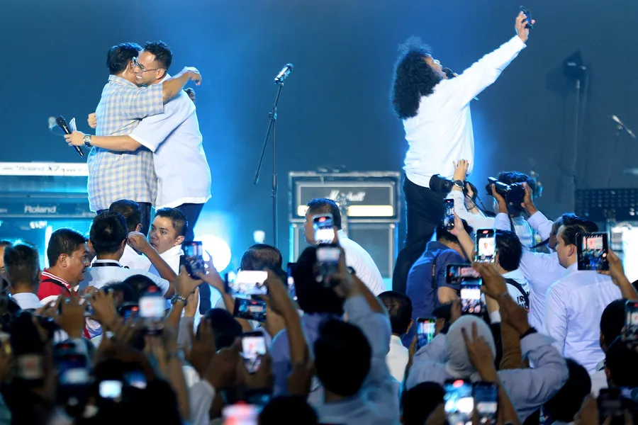 Hadir sebagai host yang memandu acara Raffi Ahmad dan Marcel Widianto begitu semangat membakar gelora pendukung paslon 02 ini.