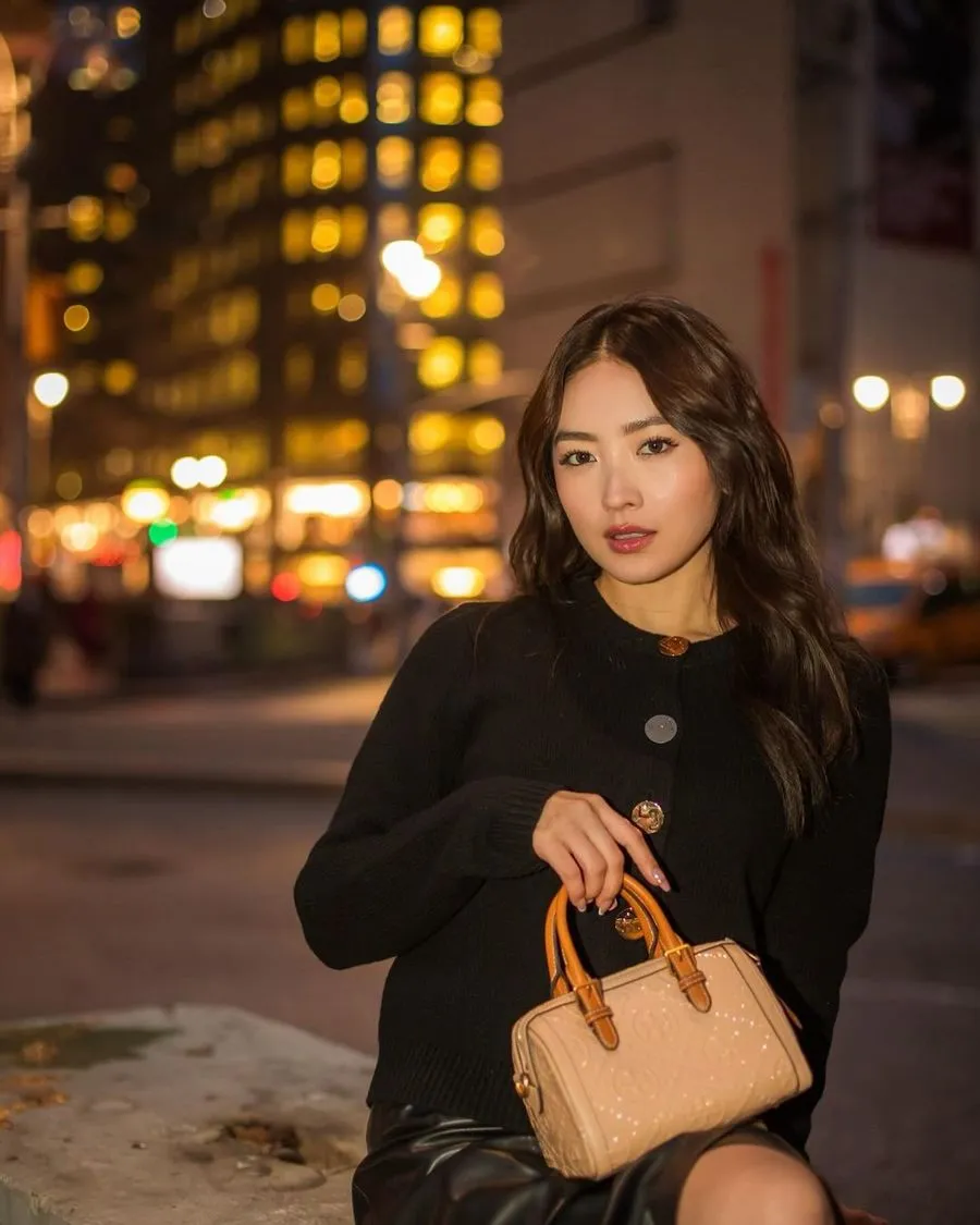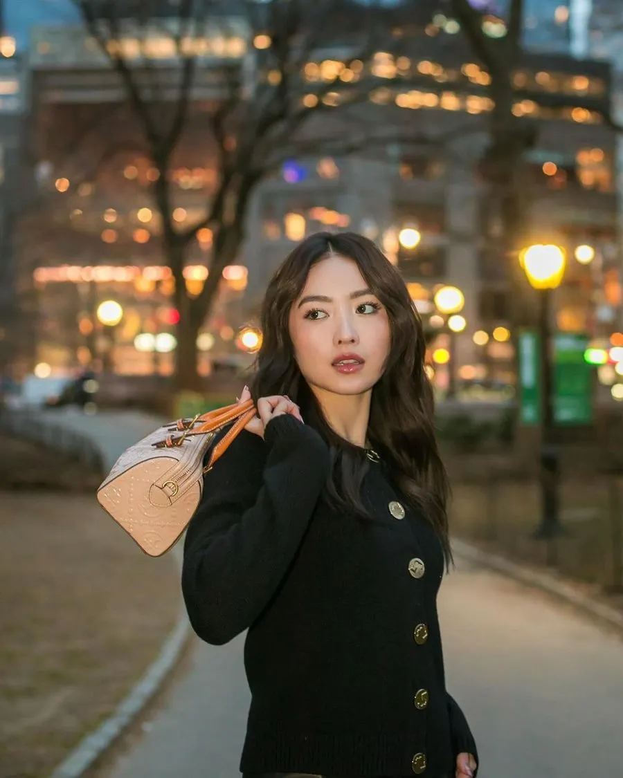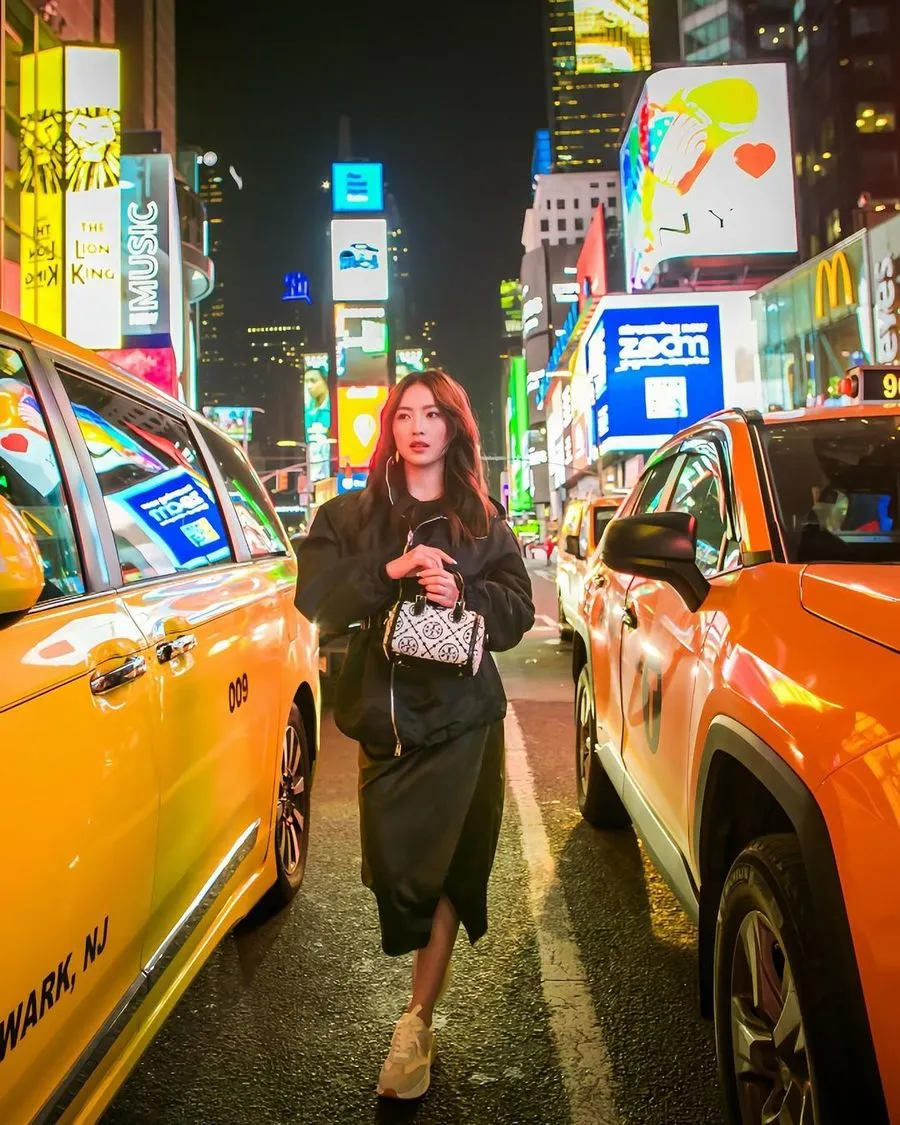 Dengan latar jalanan New York, Wilona tampil modis sambil menenteng tas Tory Burch.