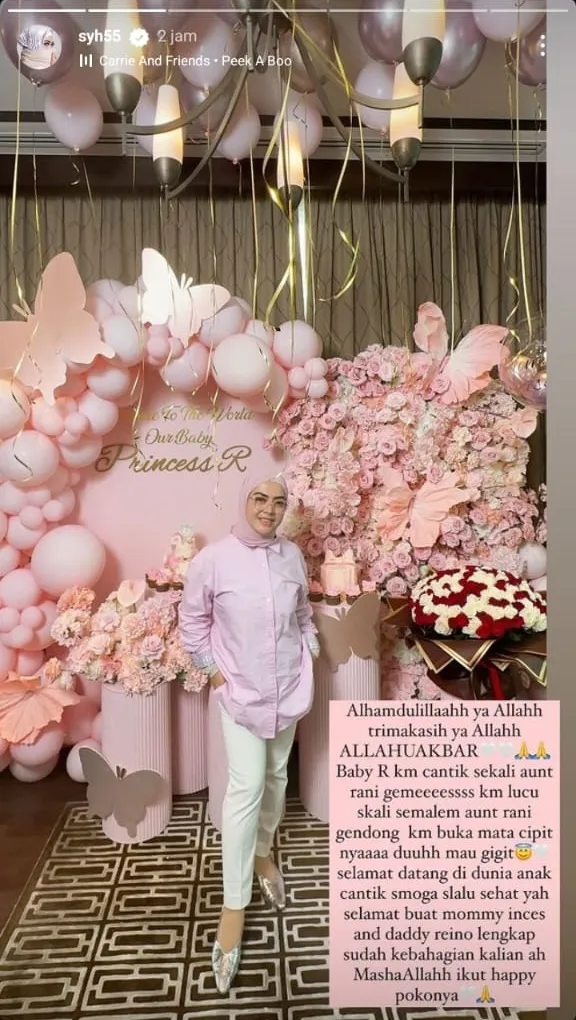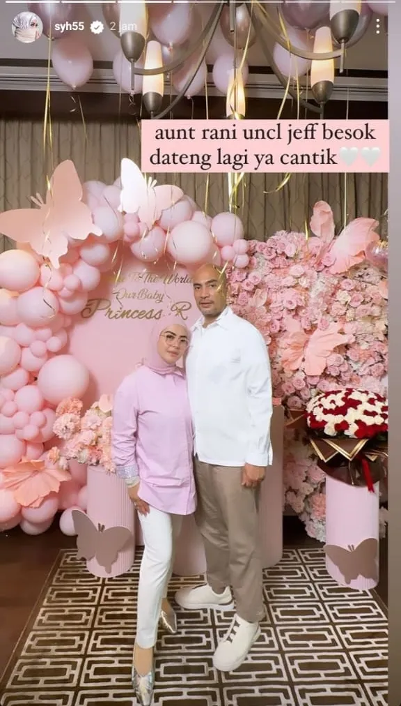 "Alhamdulillah ya Allah, terima kasih ya Allah, Allahuakbar. Baby R kamu cantik sekali. Aunt Rani gemes kamu lucu sekali semalem aunt Rani gendong kamu buka mata cipit-nya duh mau gigit," tulisnya di story Instagram.