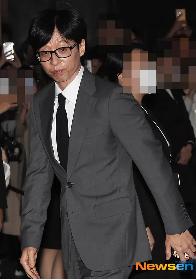 Yoo Jae Suk tampak stylish dalam setelan jas abu-abu yang elegan, menunjukkan pesona khas sang "National MC".