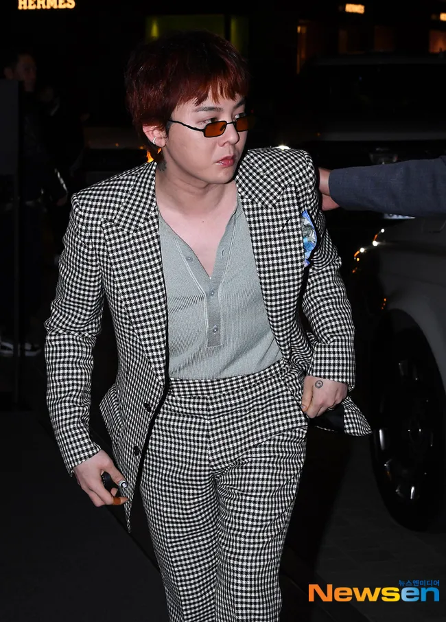 G-Dragon hadir dengan setelan jas kotak-kotak yang unik, mencerminkan gaya ikoniknya yang selalu mencuri perhatian.