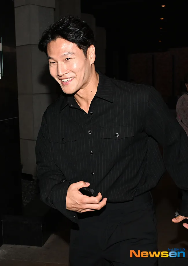 Kim Jong Kook memilih kemeja hitam bergaris yang sederhana namun tetap menonjolkan karismanya saat kondangan.