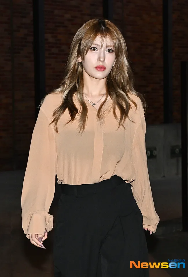 Jeon Somi berhasil mencuri perhatian dengan penampilan manis mengenakan blus krem yang senada dengan rambut coklatnya.