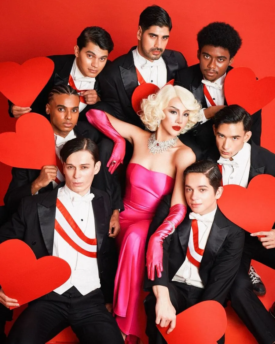 Ia kenakan wig blonde yang pendek bergelombang. Sebuah kalung besar menghiasi lehernya. Sepasang sarung tangan pink juga membalut indah kedua tangannya.