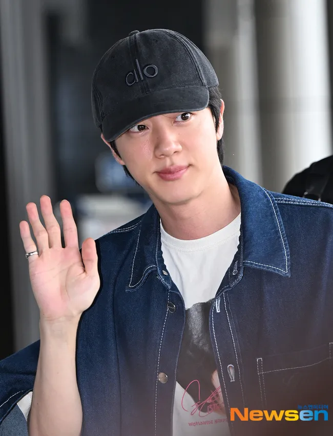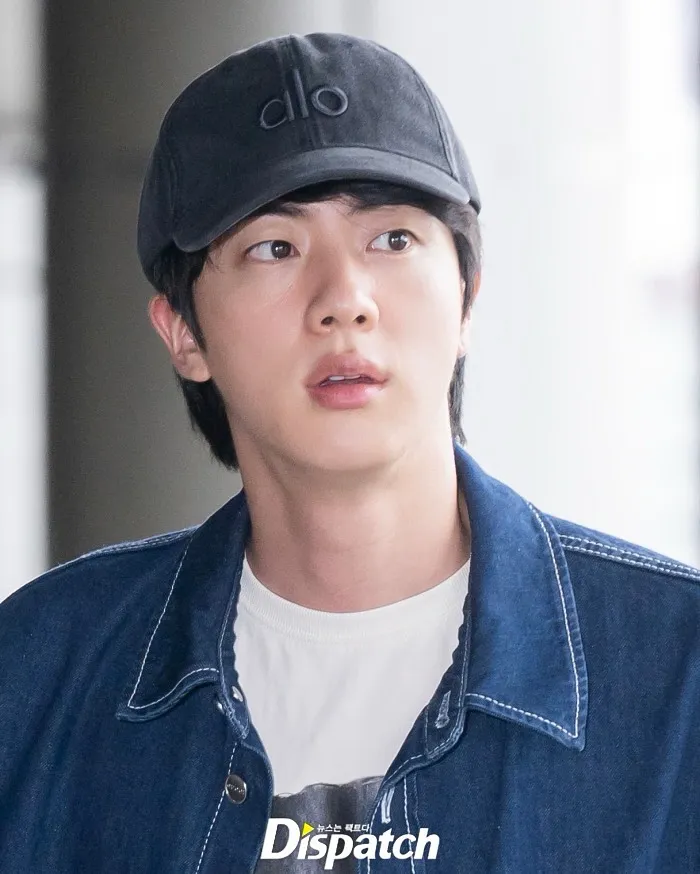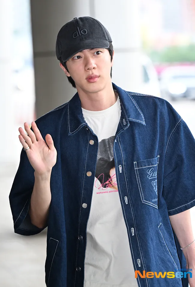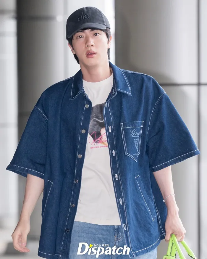 Jin BTS curi perhatian lewat airport fashion kasual dengan sentuhan denim saat berangkat ke Jepang.