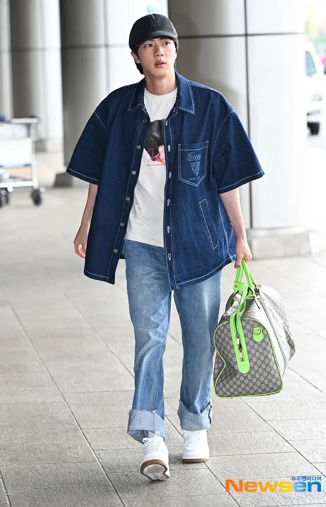 Sementara itu, Jin memakai sneaker putih dan topi baseball dari ALO, serta menenteng tas besar dengan aksen hijau muda dari GUCCI.