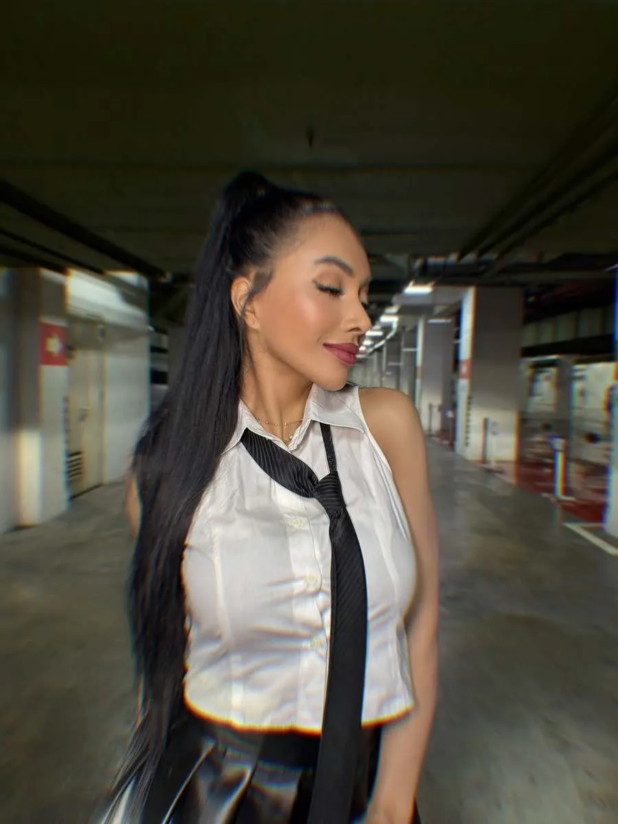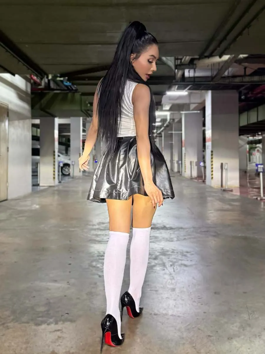 Sepatu berhak tinggi dipadu dengan kaos kaki panjang nyaris selutut membuatnya seperti anak sekolah. Denada berpose centil di basement.