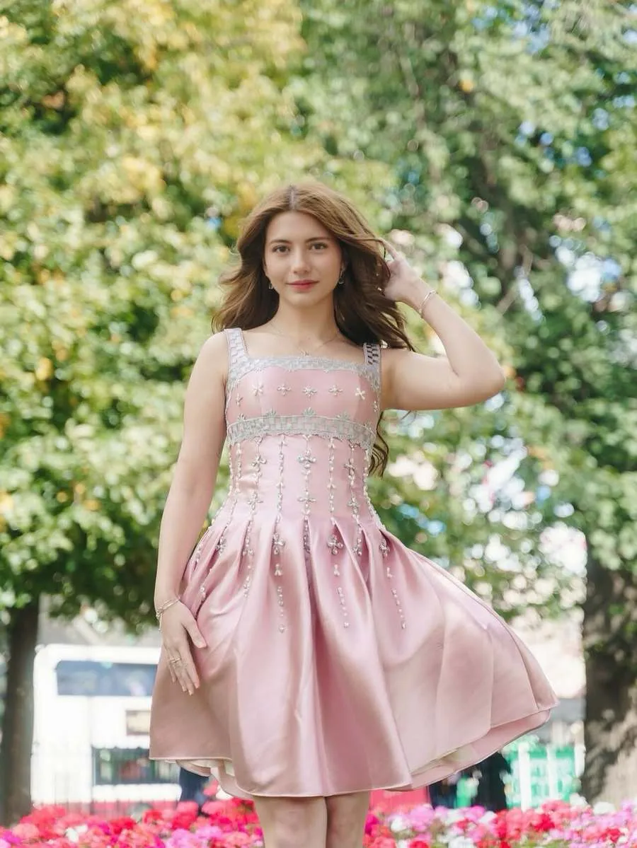 Gaun tanpa lengan itu tampak santai namun tetap memberikan kesan anggun lewat berbagai manik-manik cemerlang yang terpasang di sana-sini.