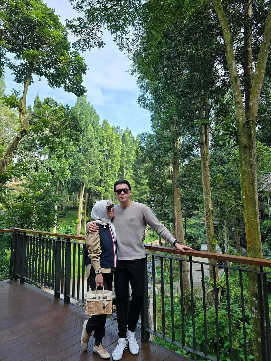 Tampil serasi, Syahrini dan Reino Barack berpose di tepi kolam dengan latar pepohonan hijau yang menciptakan nuansa tropis dan menyejukkan mata.