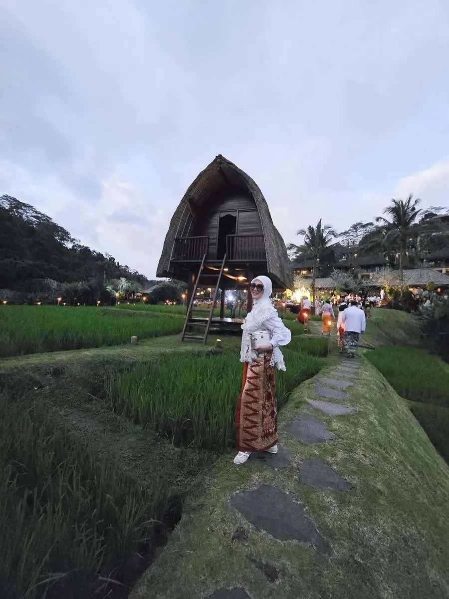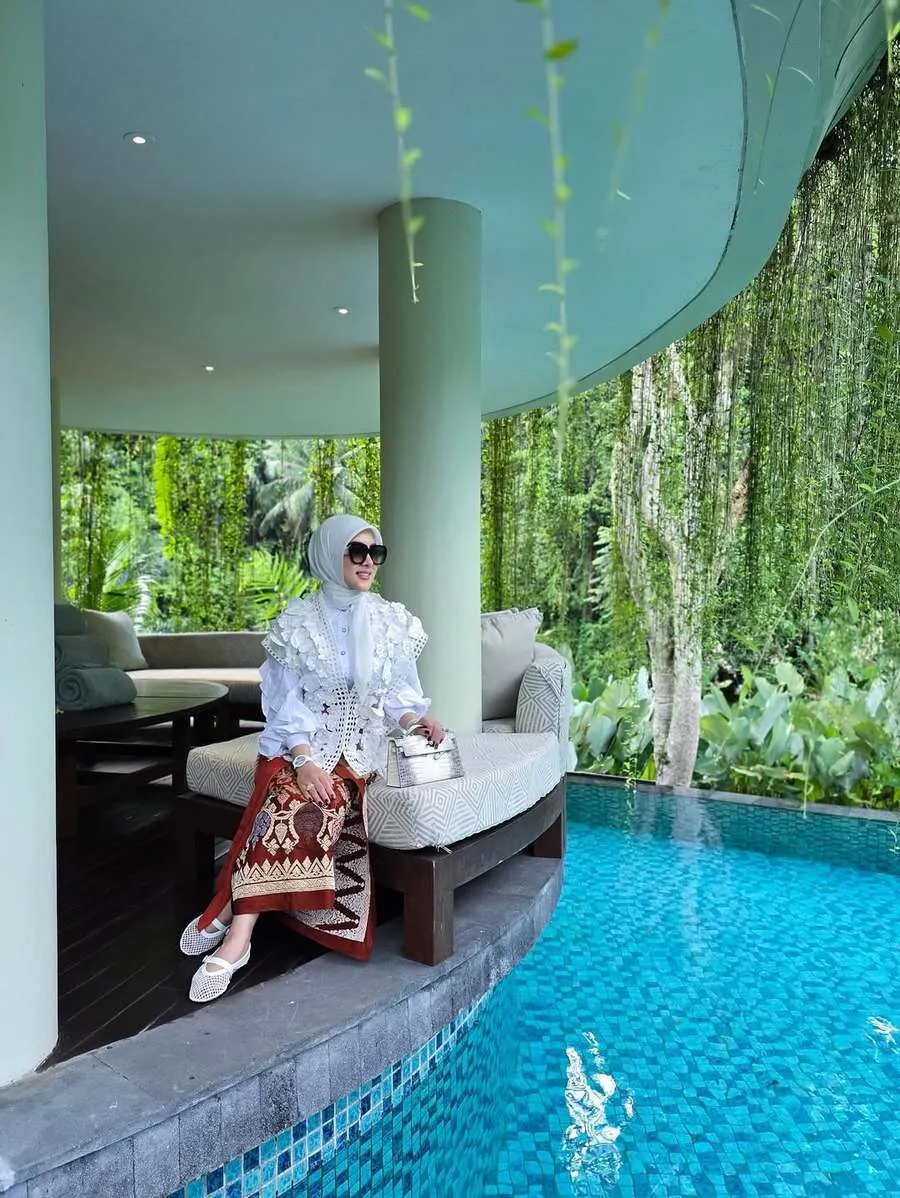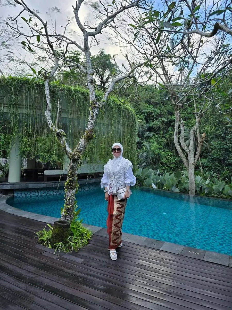 Menikmati alam di sekitarnya, Syahrini juga tampak berpose memamerkan kain tenun khas Bali yang punya kesan formal dan elegan.