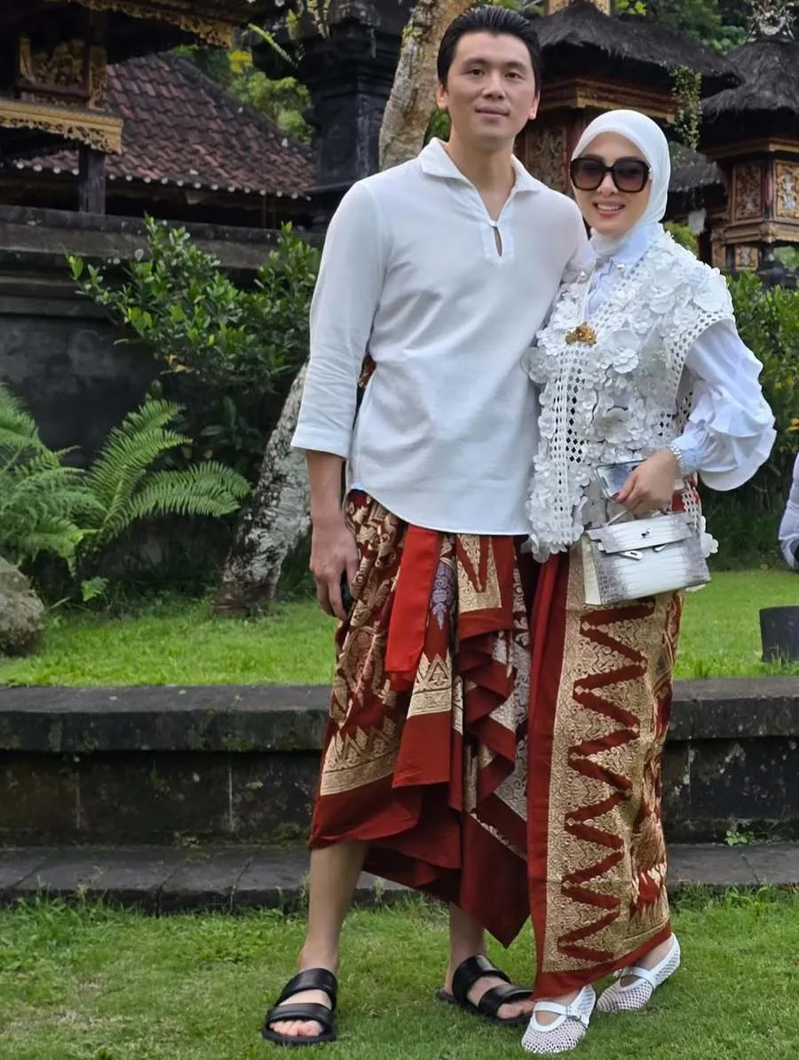 Syahrini dan Reino Barack tampil kompak mengenakan atasan warna putih yang dipadukan dengan kain songket merah kecokelatan khas Bali.
