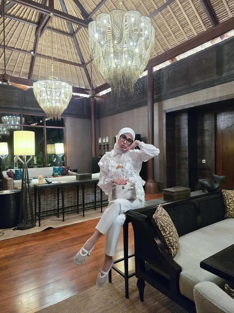 Ibu satu anak ini melengkapi gayanya dengan kerudung putih, kacamata hitam, tas tangan krem, dan sepatu hak rendah bernuansa putih yang memberi kesan feminin.