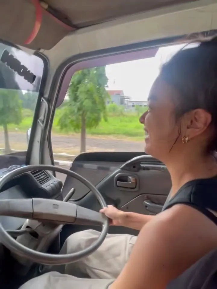 Sementara itu, kedua tangannya memegang erat setir besar truk tersebut. Ia duduk tegak di kursi sopir, memutar setir besar dengan percaya diri meski sesekali tampak berhati-hati dalam mengontrol arah.