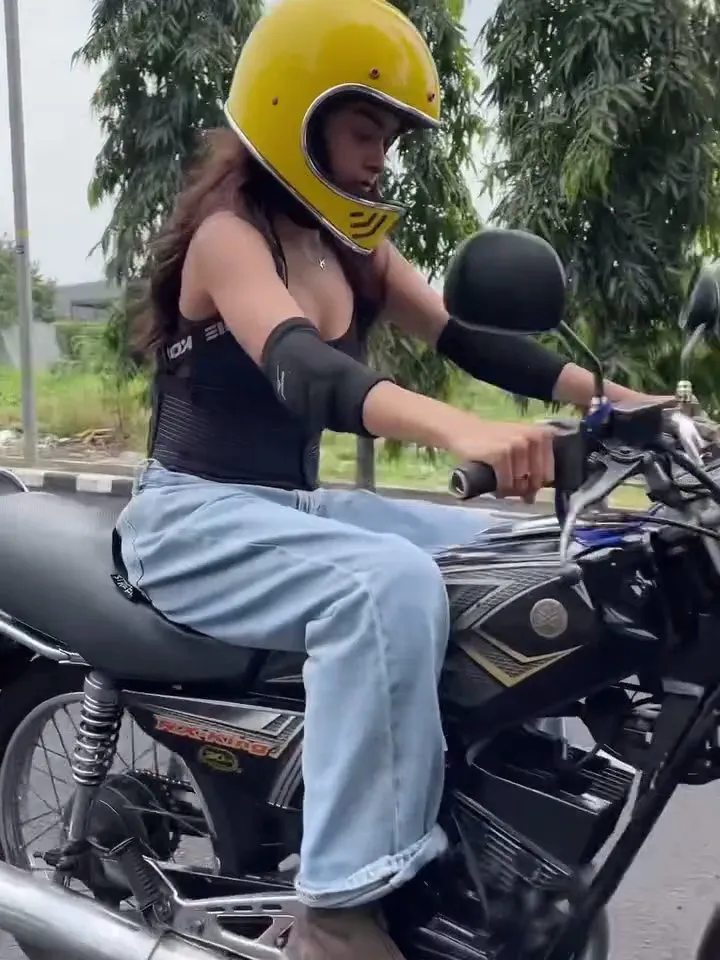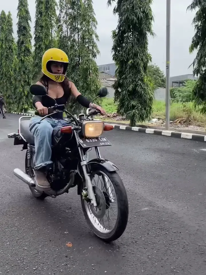 Selain mengendarai truk besar, Eva Celia juga membagikan momen saat mengendarai motor RX-King. Dalam momen ini, sang artis mengenakan perlengkapan lengkap baik helm maupun pelindung tangan.