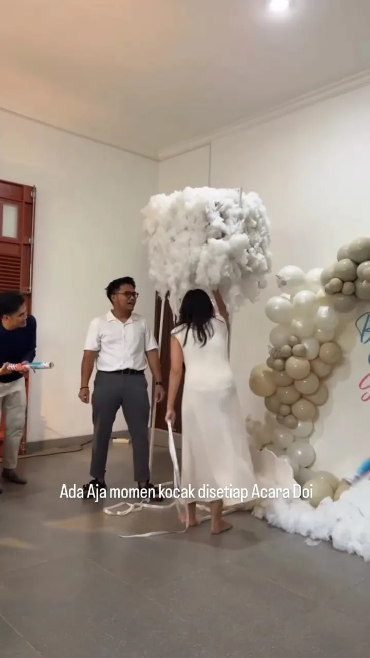 Namun saat tali ditarik, kotak itu ternyata tidak terbuka. Alhasil, tidak ada balon yang keluar dan membuat pasangan ini tertawa. Akhirnya, Ochi dan suami memutuskan membukanya secara manual.