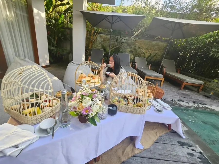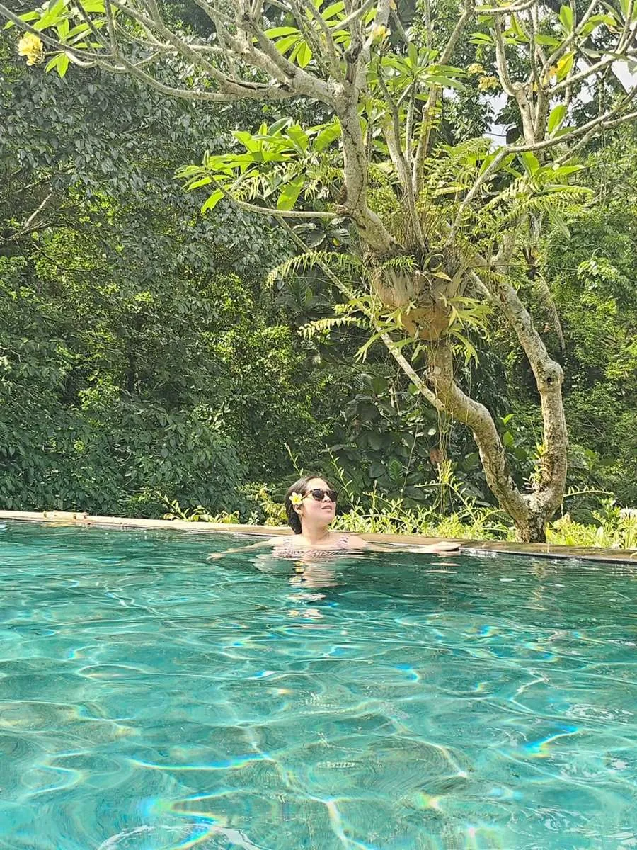 Gracia terlihat betul-betul menikmati liburannya di Bali. Ia asyik bersantai di villa hingga menghabiskan waktu di kolam renang pribadi.