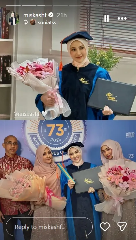 Miskah Shafa kakak ipar Fadil Jaidi baru-baru ini mengikuti wisuda S1 di Binus University. Miskah sangat bahagia bisa menyelesaikan kuliahnya, meski sudah menjadi seorang istri dan punya anak.