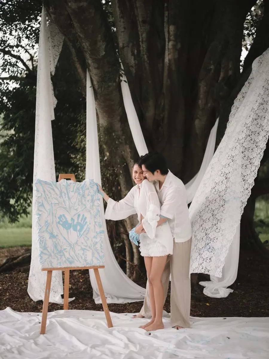 Setelah mata mereka dibuka, barulah Angga dan Shenina tahu kalau warna yang tadi ada di kanvas adalah biru yang artinya gender anak mereka adalah laki-laki.