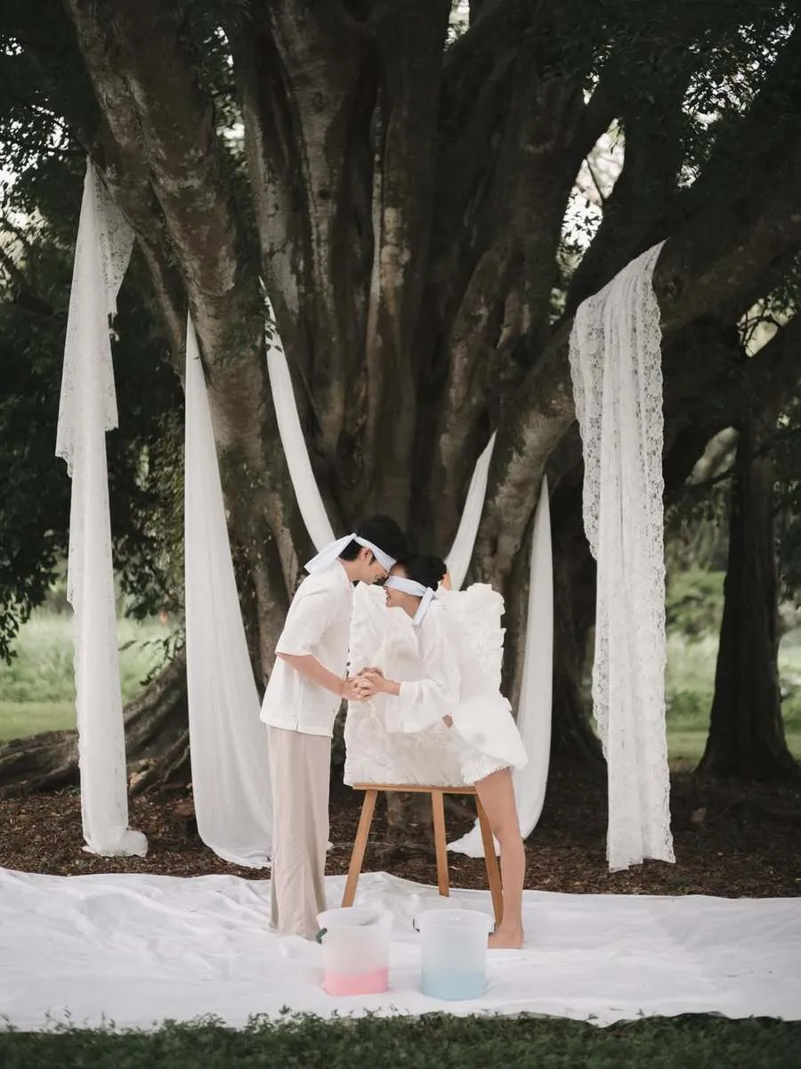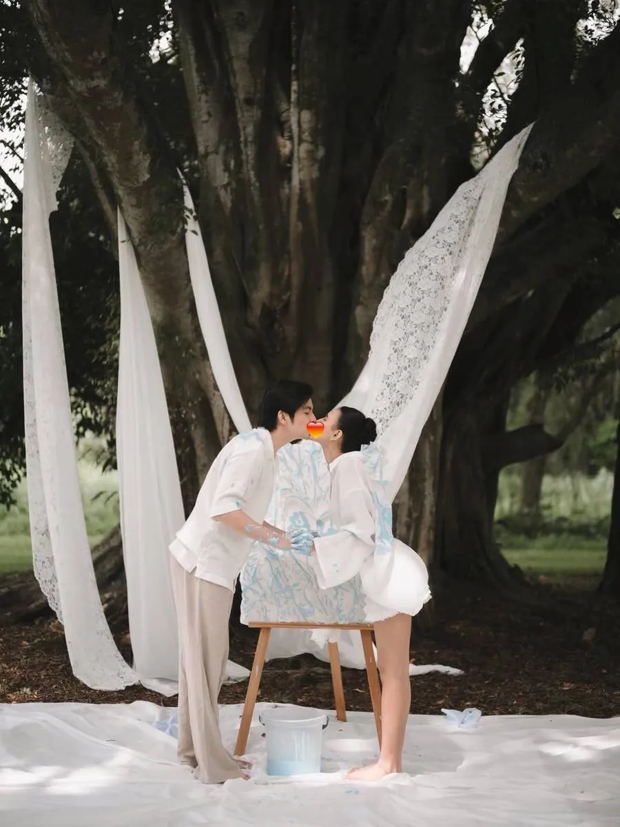Jadi untuk gender reveal ini, Angga dan Shenina ditutup dulu matanya sebagai kejutan bagian mereka. Tangan mereka diberi cat minyak.