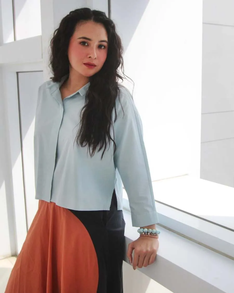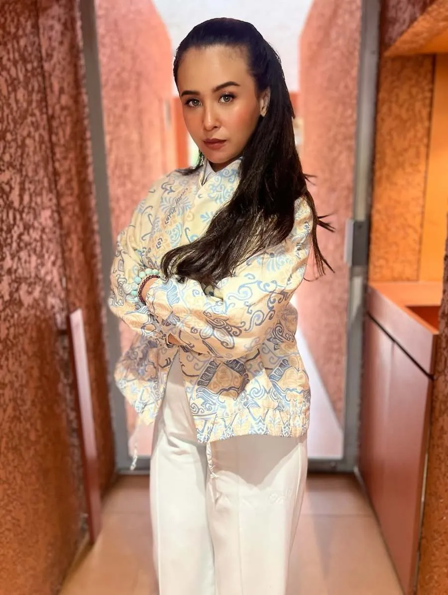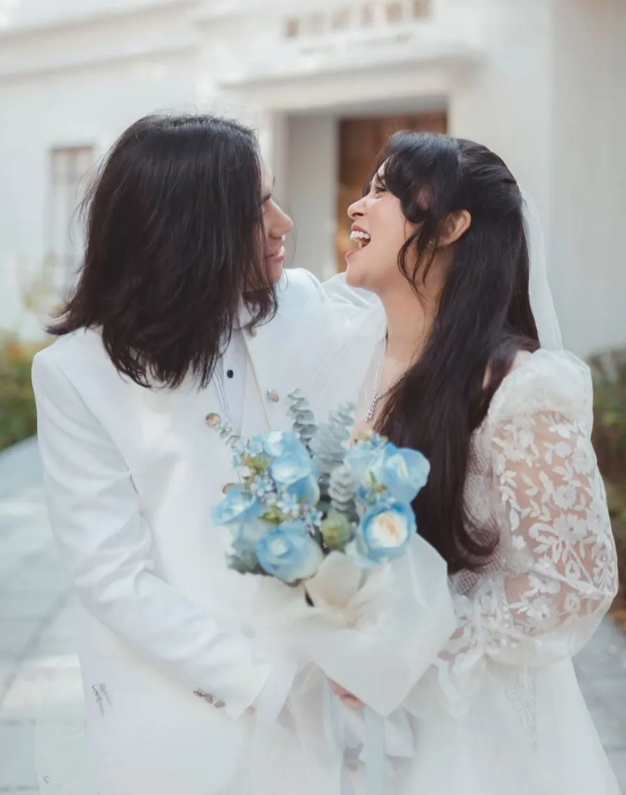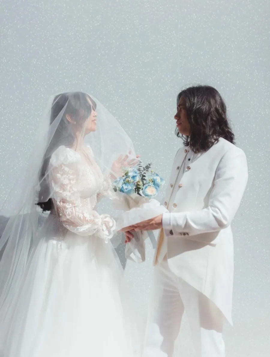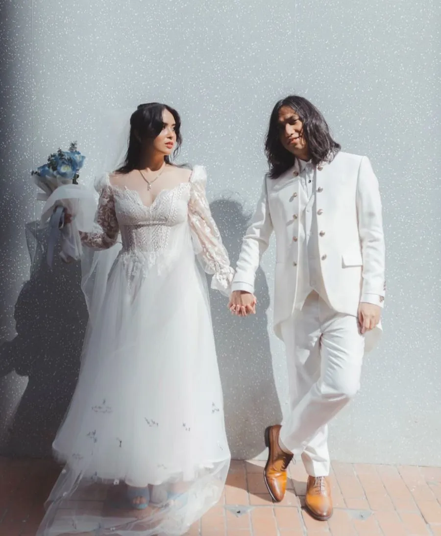 Mereka tampil menawan dengan busana putih. Ayushita tampak anggun dengan dress dan memegang buket bunga.