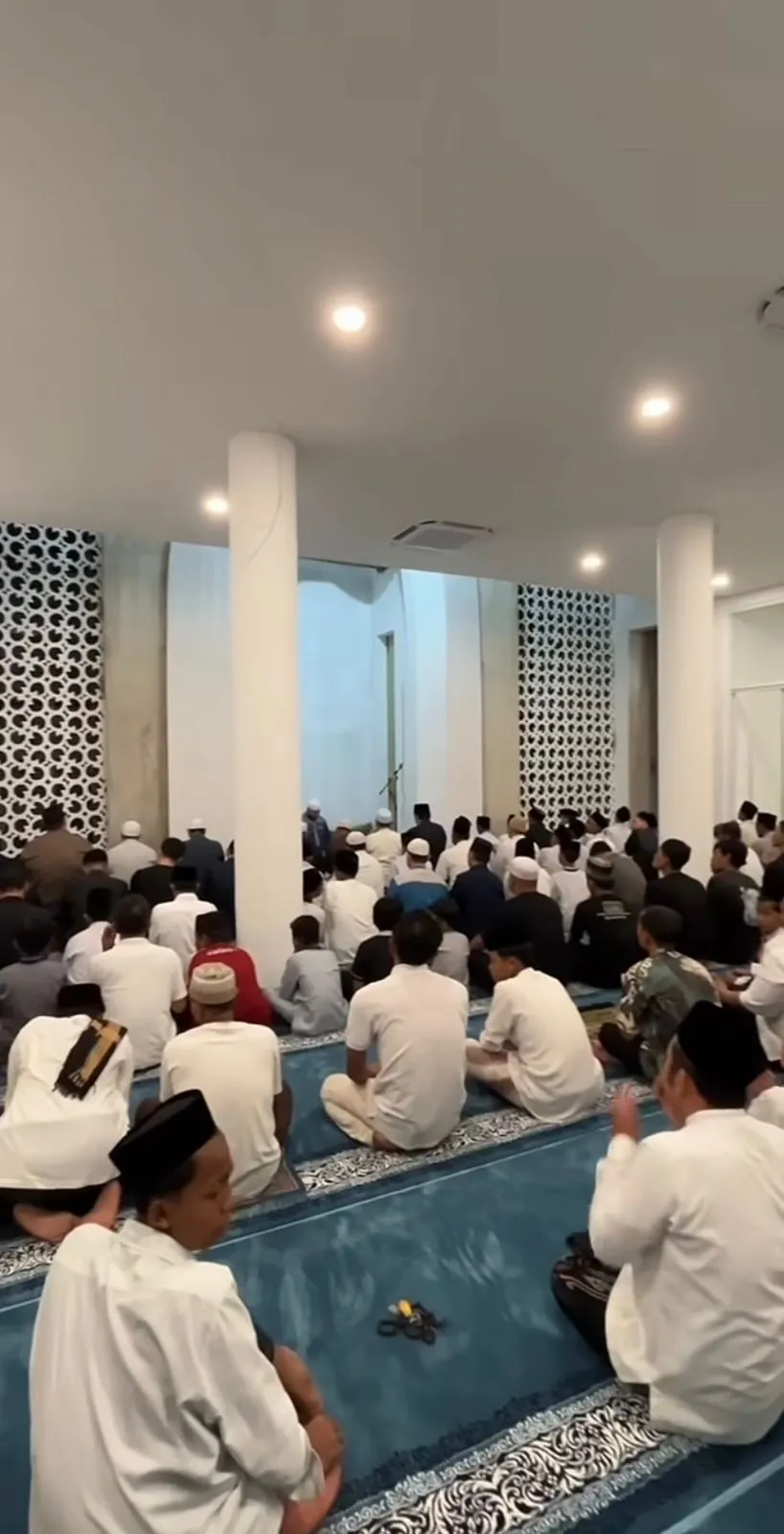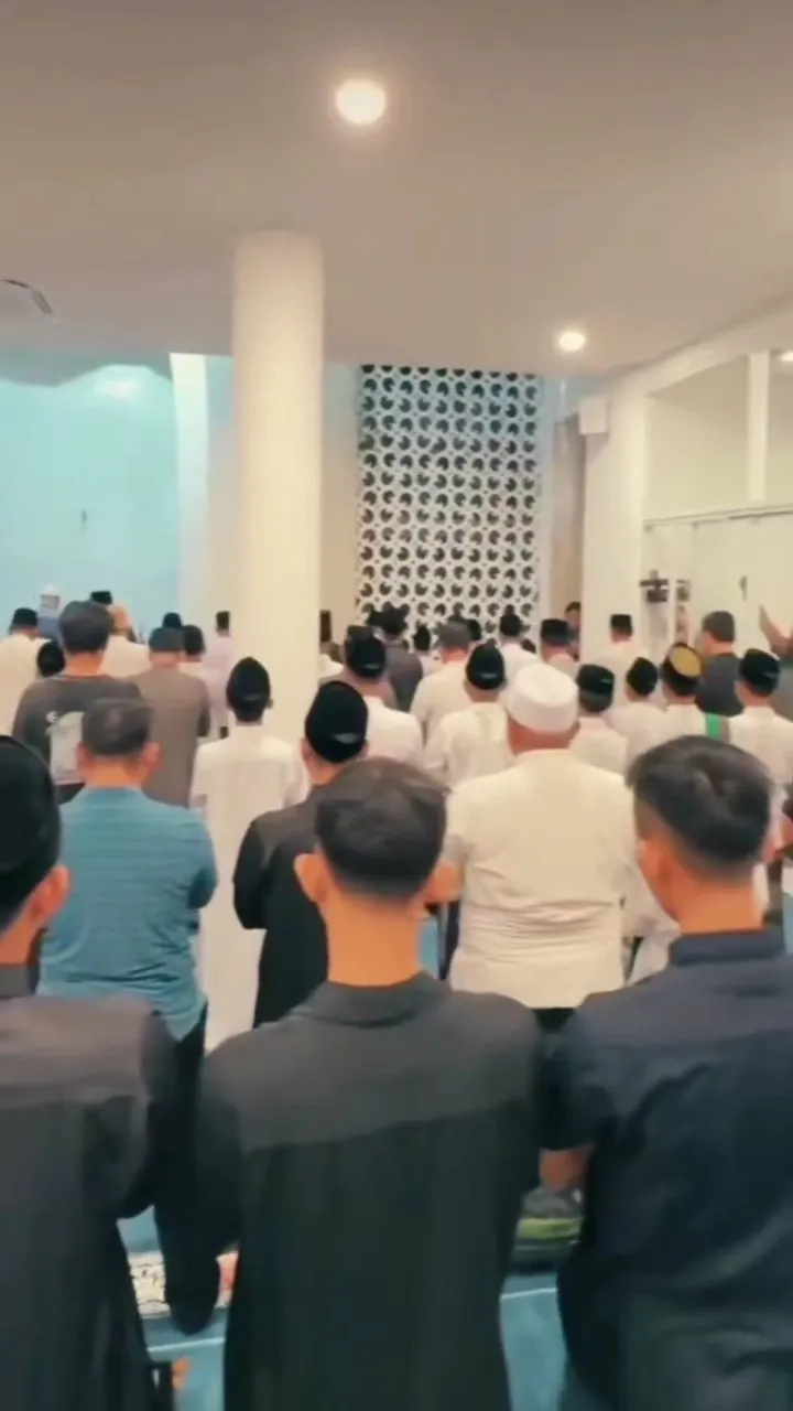 Dari foto yang beredar, terlihat jamaah memenuhi ruang utama masjid dengan saf yang rapi. Nuansa putih pada dinding serta pilar besar memberi kesan bersih dan luas.