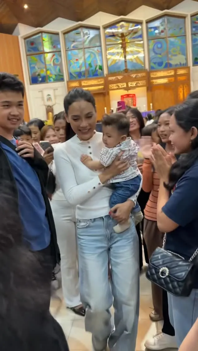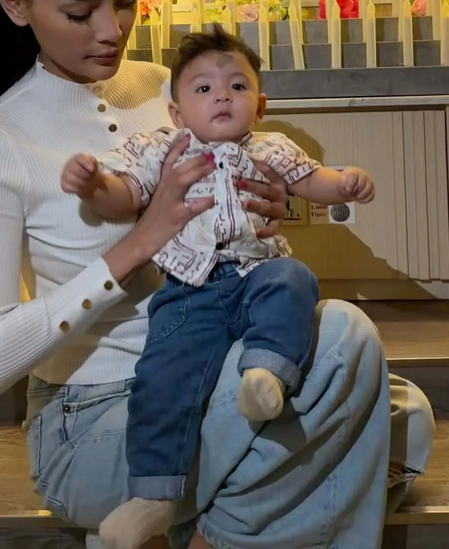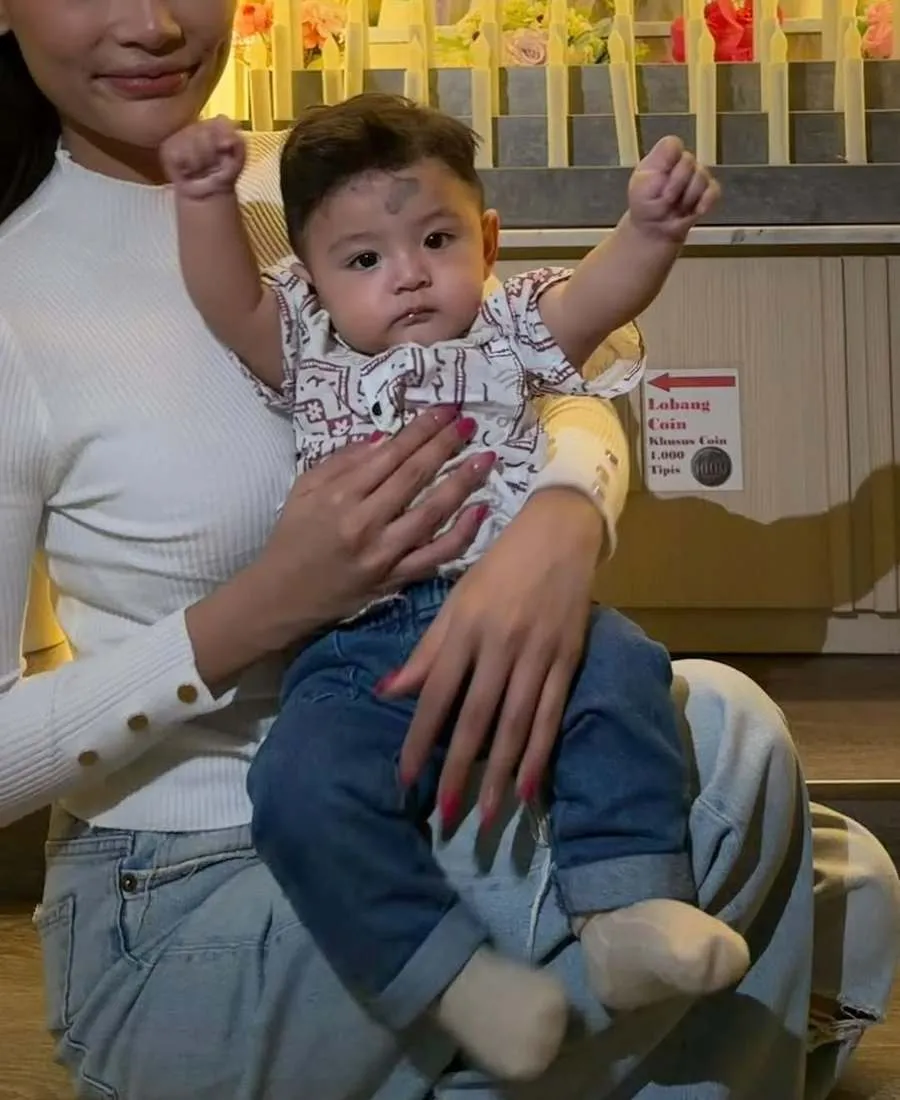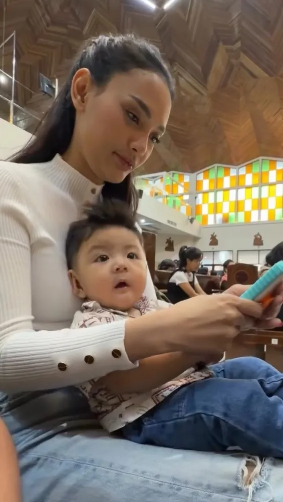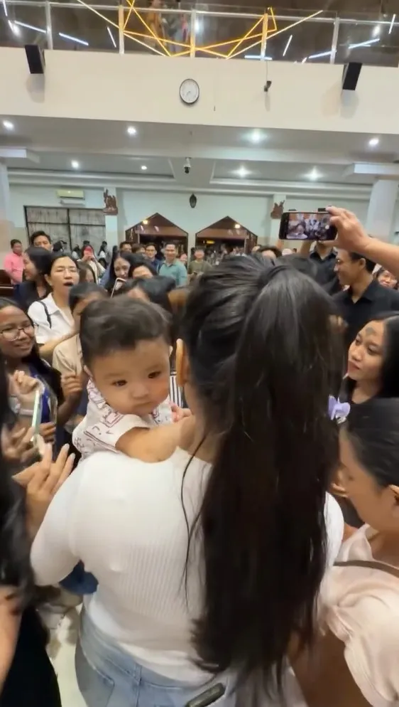 Wajahnya yang imut namun ekspresif sukses mencuri perhatian banyak orang selama di gereja. Dalam gendongan Erika, Andrew tampak nyaman dan sesekali mengangkat tangannya, menambah kelucuan yang membuat suasana semakin hangat.
