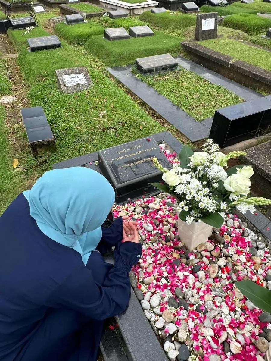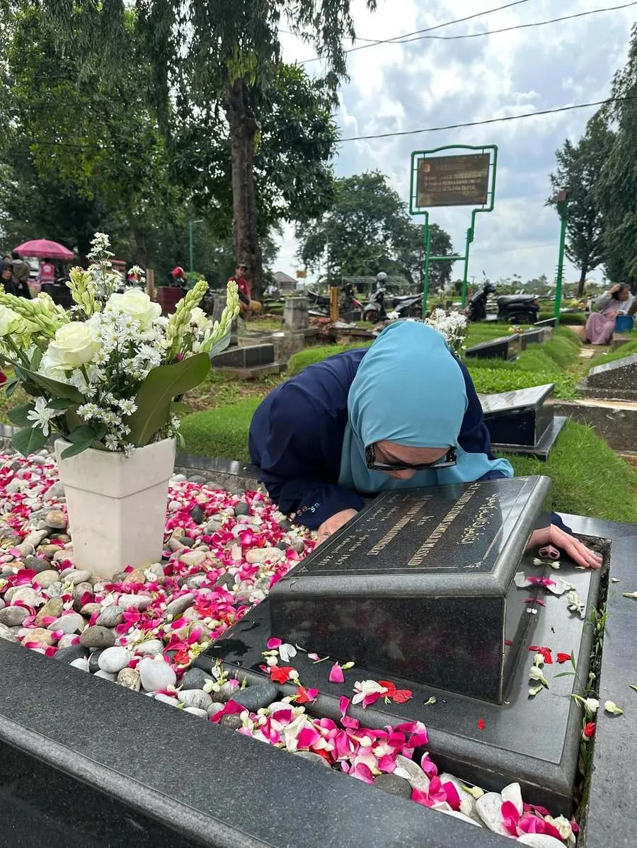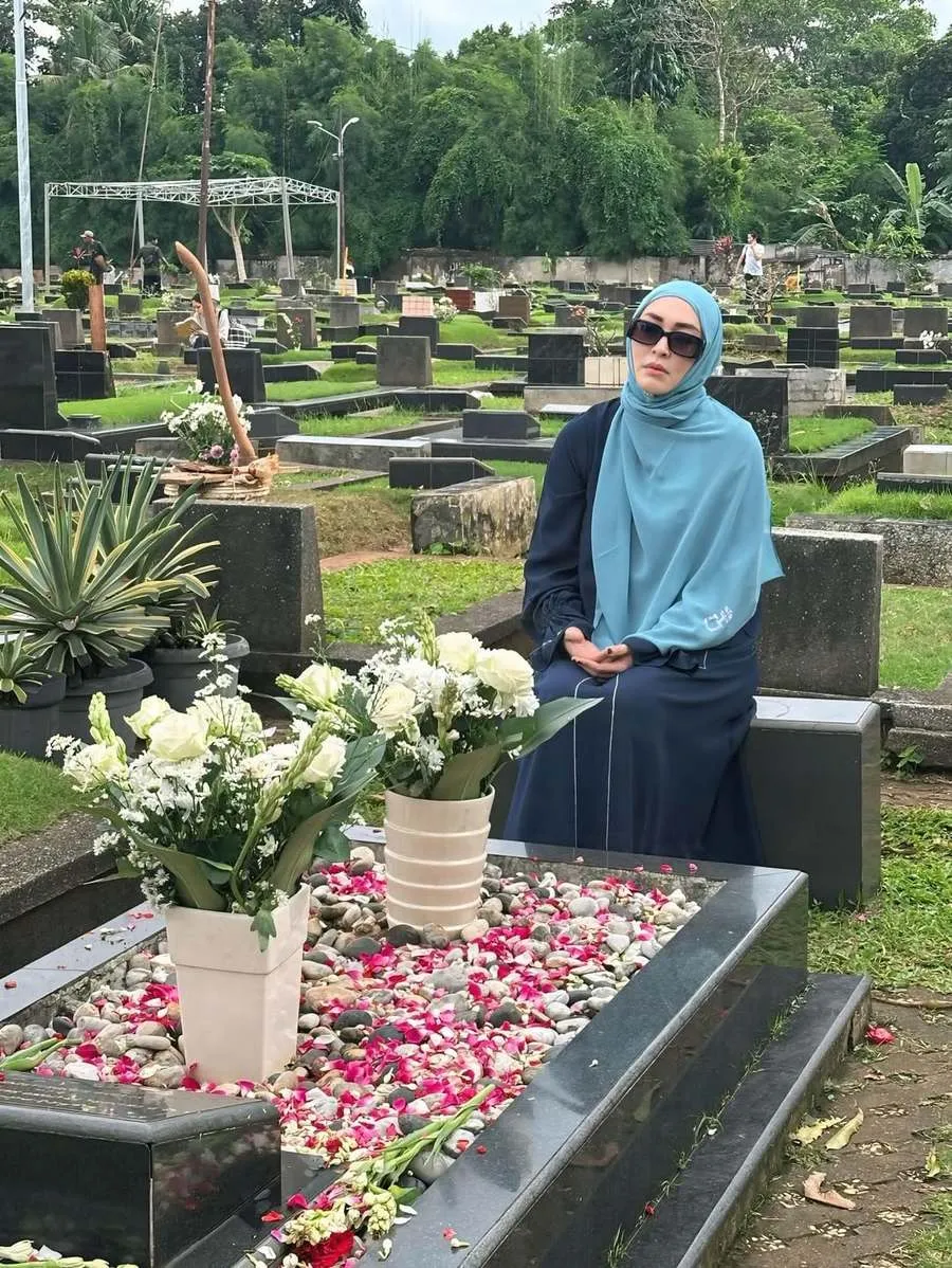 Ibu sambung Zahwa dan Aaliyah Massaid itu terlihat duduk di sisi makam, mengenakan gamis warna navy gelap dan kerudung biru lembut. Kacamata hitam menutupi matanya, namun bahasa tubuhnya seakan memancarkan kesedihan yang tertahan.