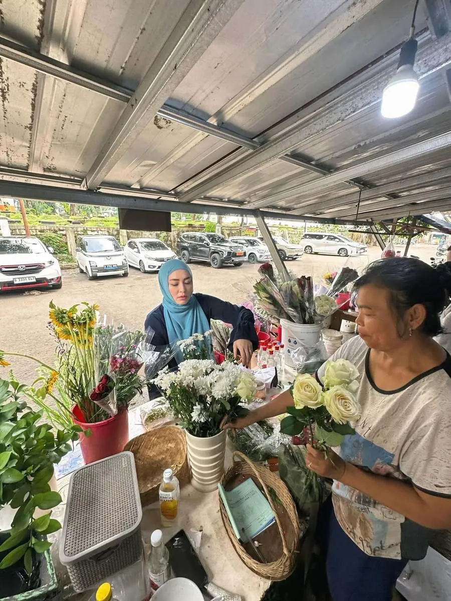 Sebelum ziarah, Angie terlihat belanja bunga terlebih dahulu untuk ditaburkan ke makam. Ia sendiri yang memilih bunga-bunga itu di toko bunga dekat makam. Wajahnya tampak bahagia seakan ingin menemui kekasihnya.