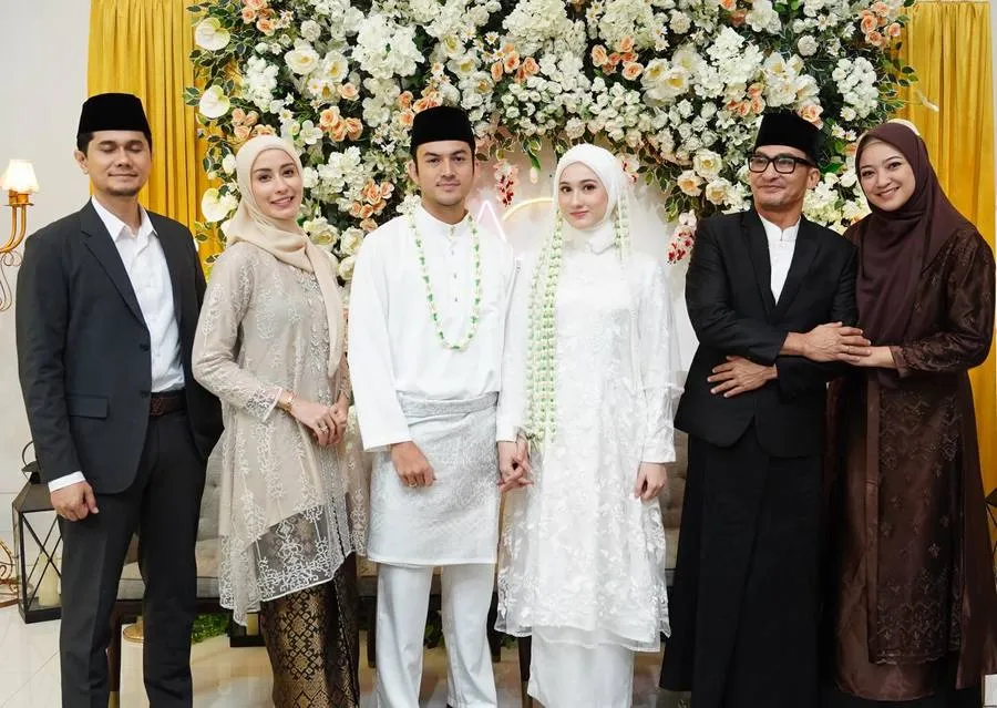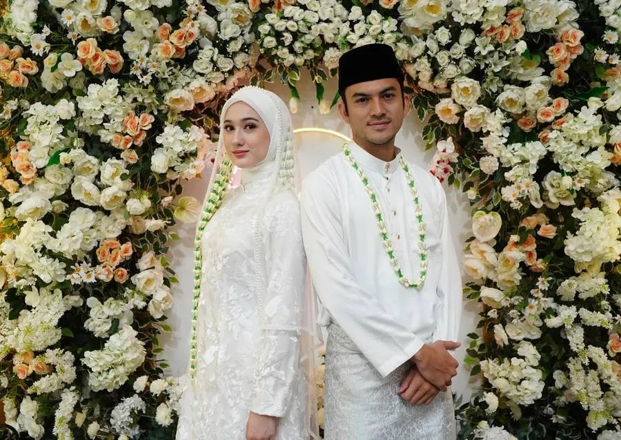 Rizky Nazar & Laura Moane terlihat berdiri bersama dalam sebuah pelaminan. Mereka tampil dengan busana putih seperti pengantin pada umumnya. Aktor ganteng dan aktris cantik ini tampak serasi dengan busana tersebut.