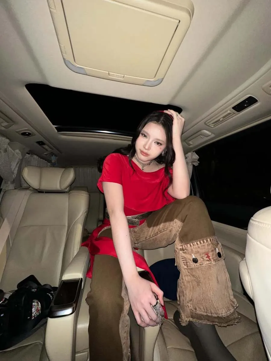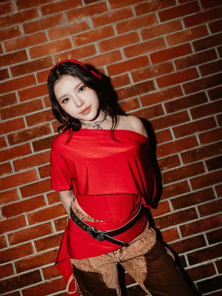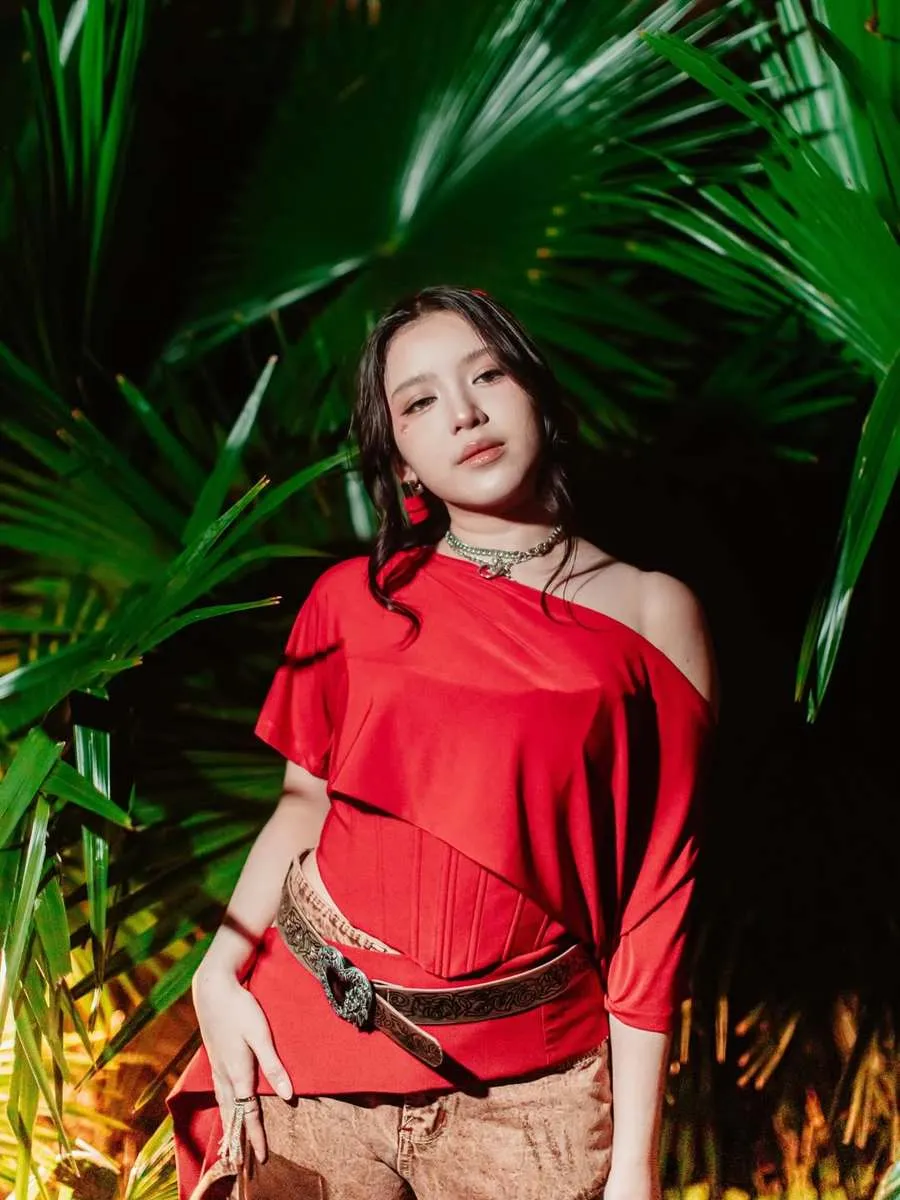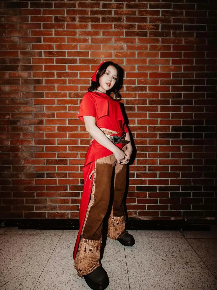 Begini outfit keseluruhan penyanyi muda tersebut. Atasan merah dengan dipadu celana khas koboi.