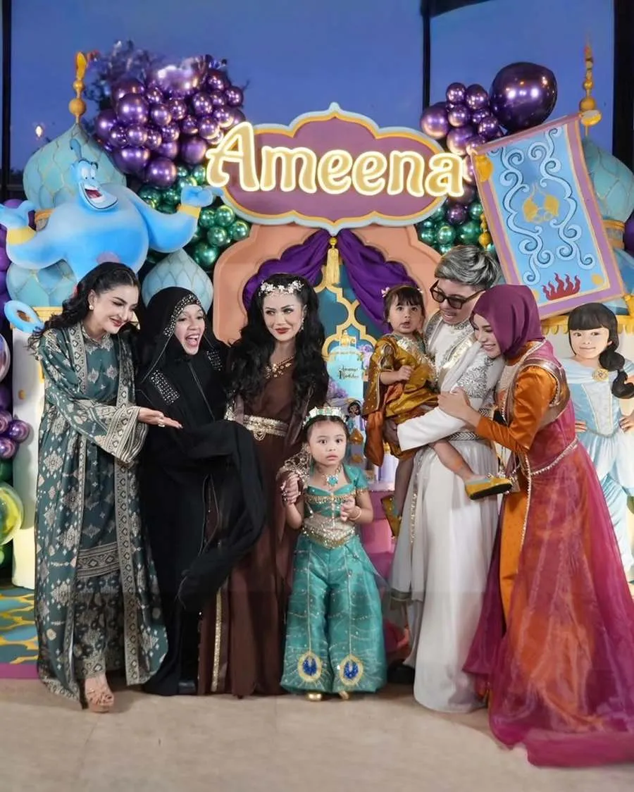 Geni Faruk tampil sangat kompak bersama Atta Halilintar dan Aurel Hermansyah di perayaan ulang tahun Ameena. Nenek dan kedua orang tua Ameena ini kompak kenakan kostum ala film Aladin yang jadi tema acara.