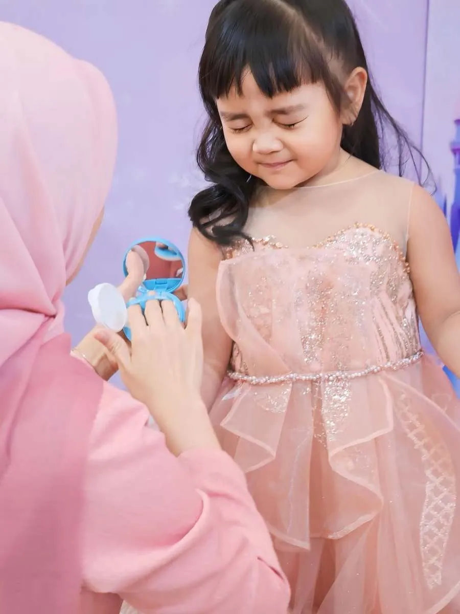 Bella Shofie turun tangan merias Dayana sendiri agar tampil maksimal. Riasan yang diaplikasikan tetap natural, menyesuaikan dengan usia si kecil.