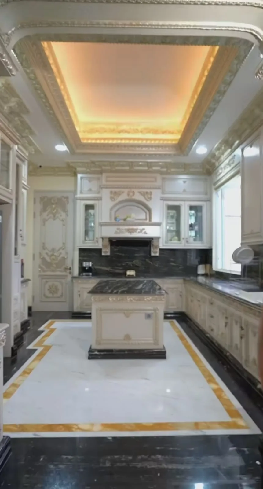 Dapur mewah Saaih Halilintar mengusung gaya Eropa klasik. Ruangan tersebut didominasi warna putih dan ukiran emas yang elegan. Interior berkelas ini membuat area memasak terlihat begitu estetik dan menawan.