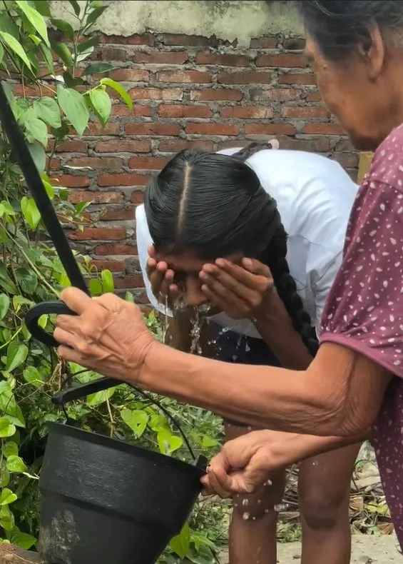 Pakaian Sawitri tampak sederhana, bahkan menikmati cuci muka menggunakan air sumur.