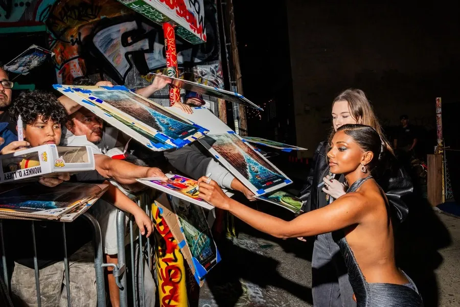 Di sisi lain, Charithra Chandran, pemeran Nefertari Vivi, juga terlihat memberikan tanda tangan kepada para penggemar yang membawa poster maupun merchandise ONE PIECE. Interaksi ini membuat suasana red carpet terasa semakin hangat.