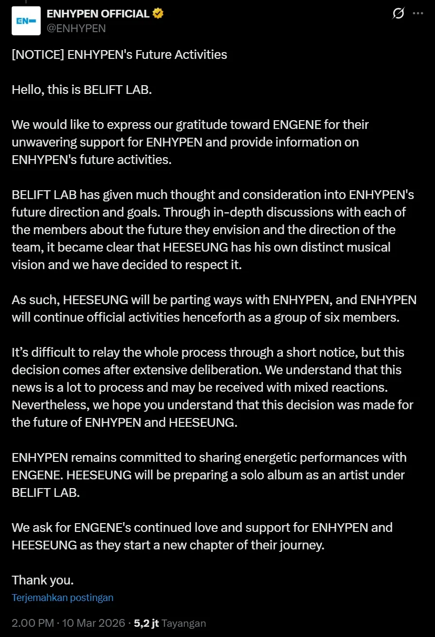 Kabar mengejutkan datang dari Heeseung yang diumumkan akan meninggalkan ENHYPEN setelah enam tahun berkarier bersama. Meski tak lagi promosi dengan grup, ia tetap berada di bawah naungan Belift Lab.