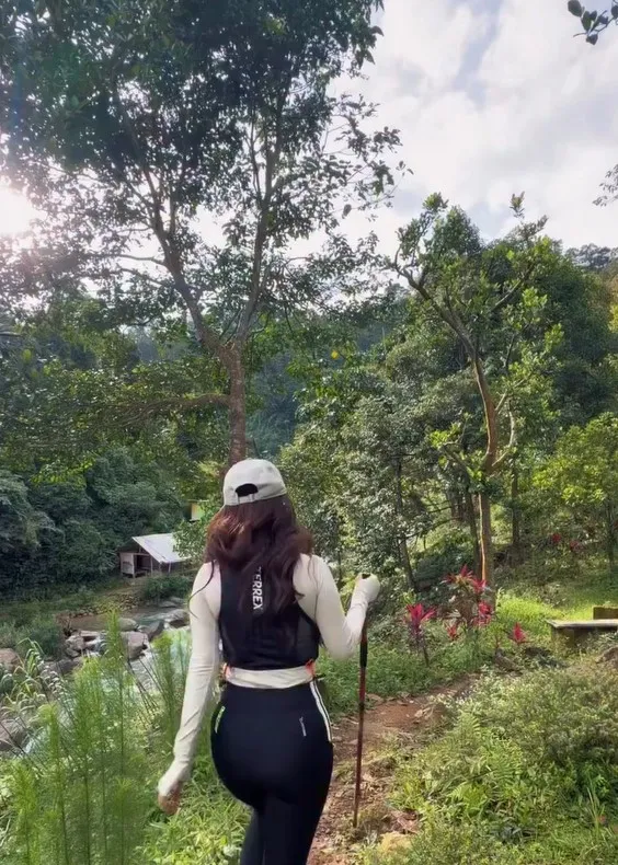 Untuk trekking ringan ke Curug Leuwi Hejo, Dinda memilih outfit sederhana berupa kaus lengan panjang yang dipadukan dengan rompi, serta membawa trekking pole sebagai penopang saat melalui jalur berbatu.