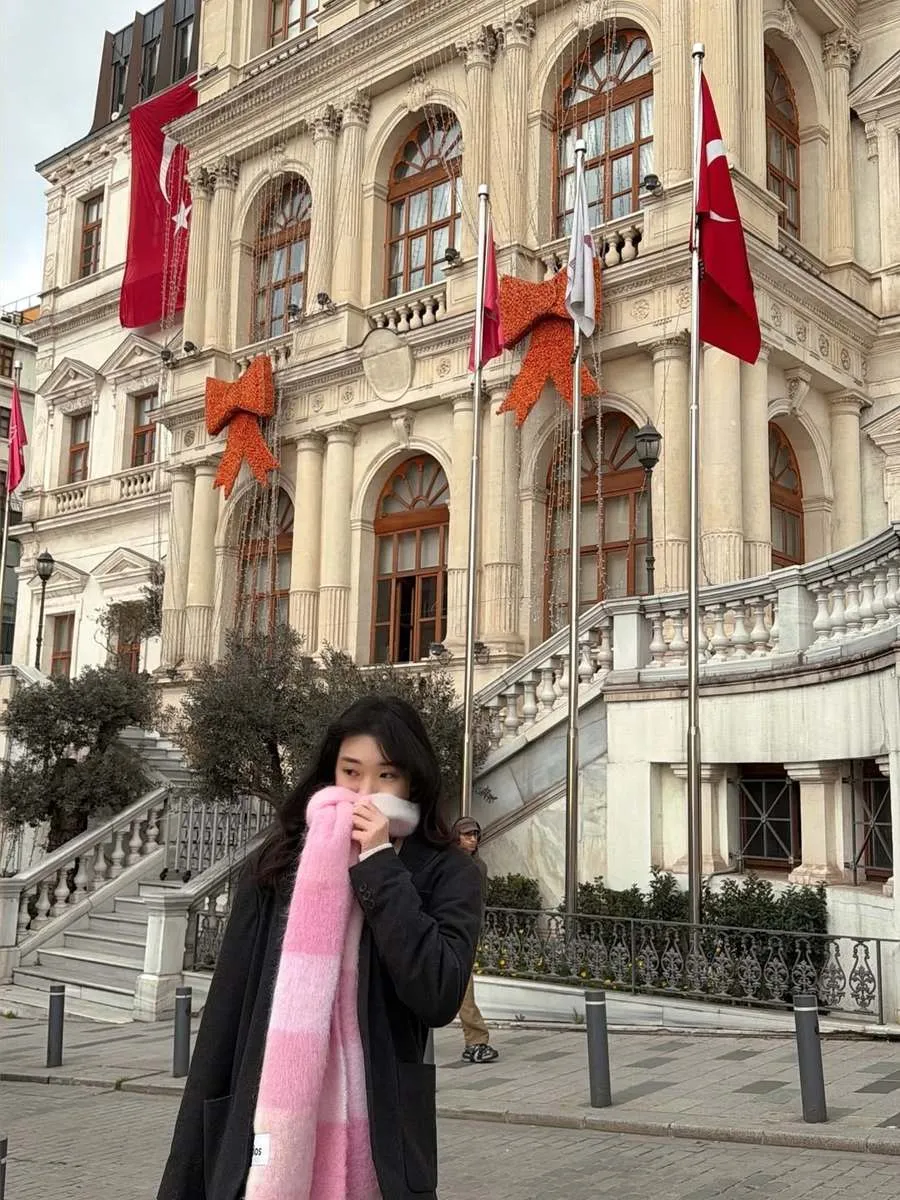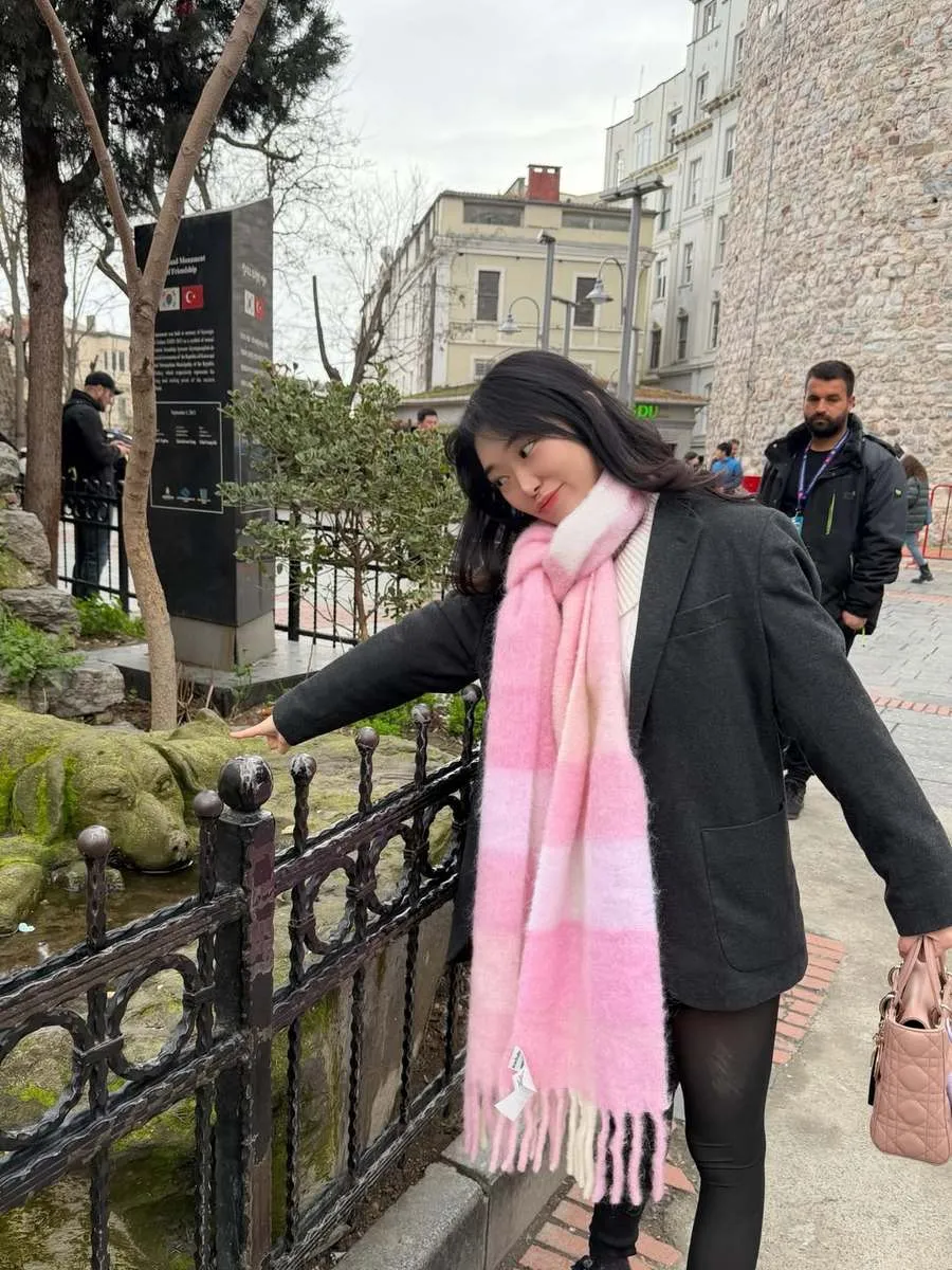 Selebgram dan konten kreator ini tampil dalam berbagai outfit stylish. Termasuk memakai mantel abu-abu dan scarf pink membuat tampilannya chic dan hangat.