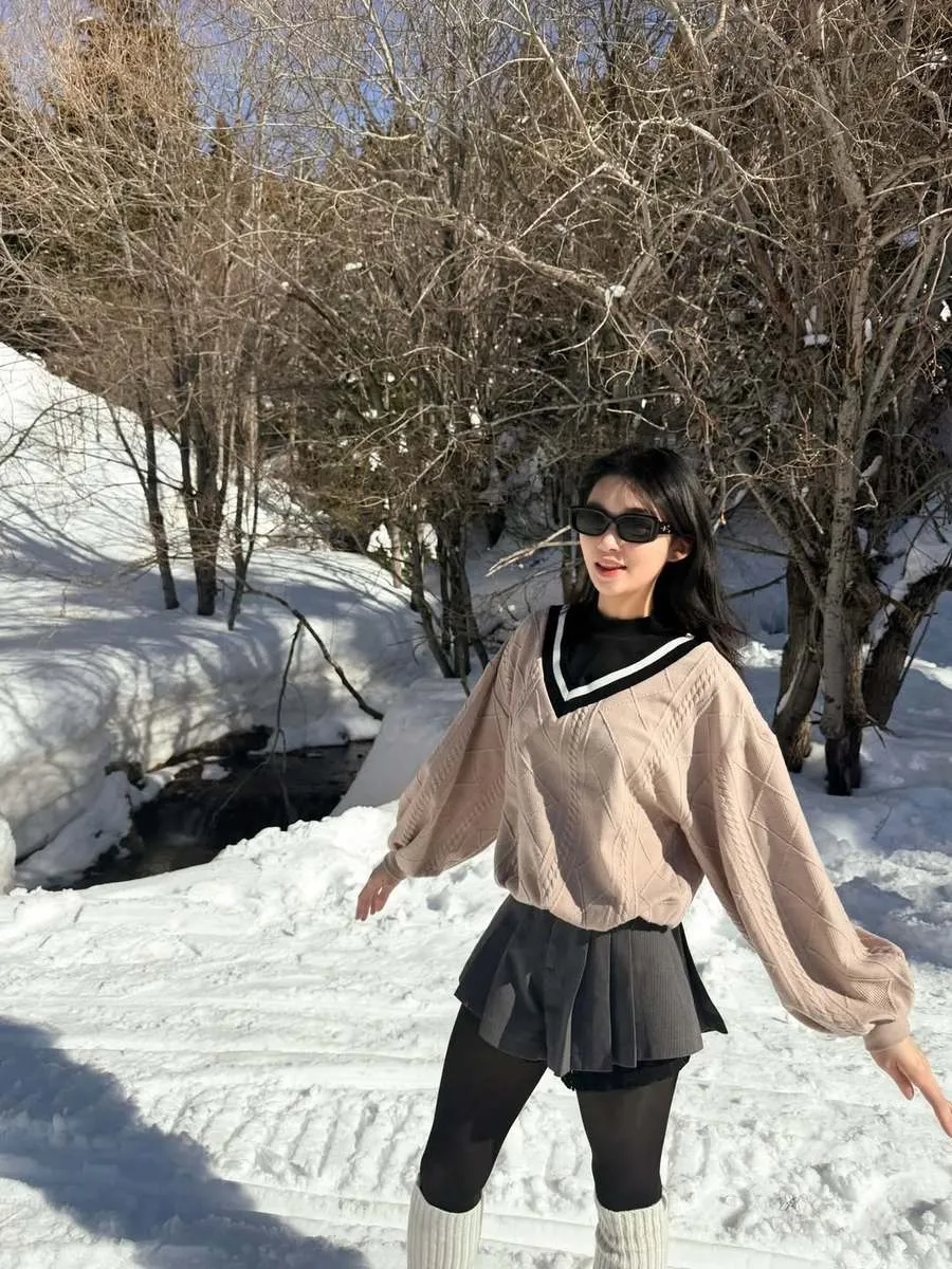 Livy juga berpose santai sambil membawa tas kecil di tengah pemandangan salju. Kombinasi busana simpel dan ekspresi ceria menciptakan vibe liburan yang menyenangkan.