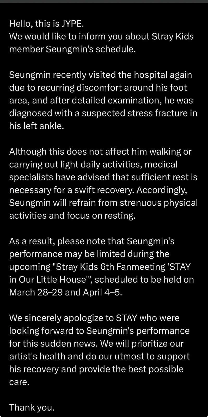 Dikonfirmasi di pemberitahuan yang sama oleh pihak Stray Kids lewat unggahan X, kondisi ini disebut tidak sampai mengganggu aktivitas ringan seperti berjalan kaki atau kegiatan sehari-hari.