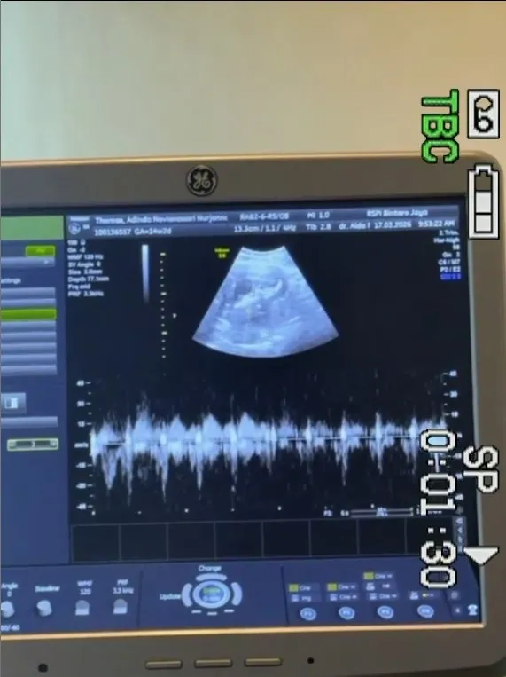Adinda juga mengunggah video rekaman monitor yang menunjukkan detak jantung dari janin yang sedang dikandung oleh bintang film KKN DESA PENARI ini.