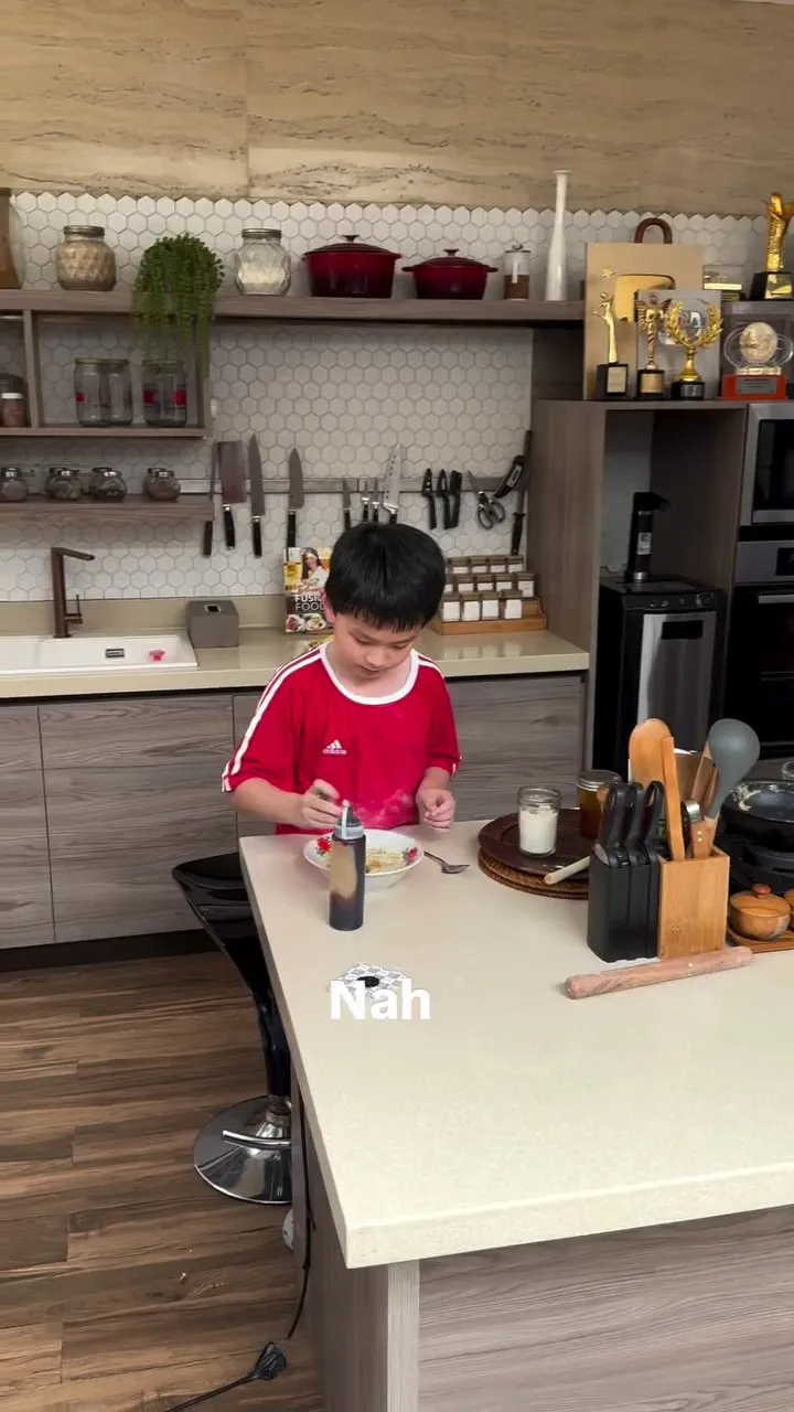 Menariknya, ada beberapa trofi dan pajangan terlihat menghiasi rak dapur. Hal ini memberi sentuhan personal di dapur Chef Devina Hermawan.