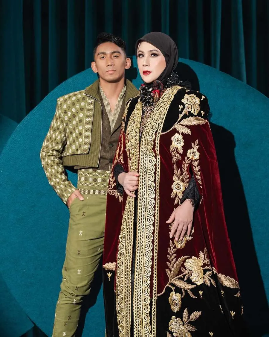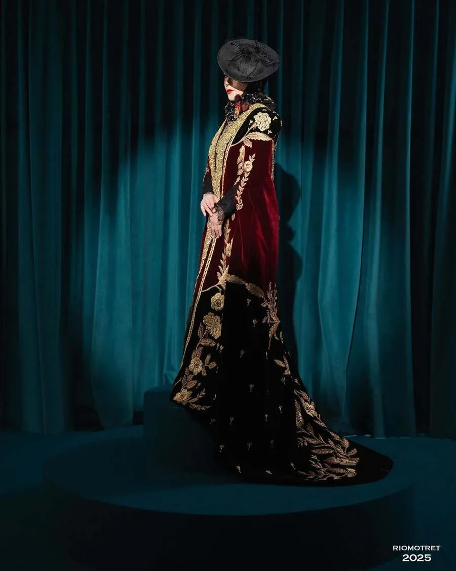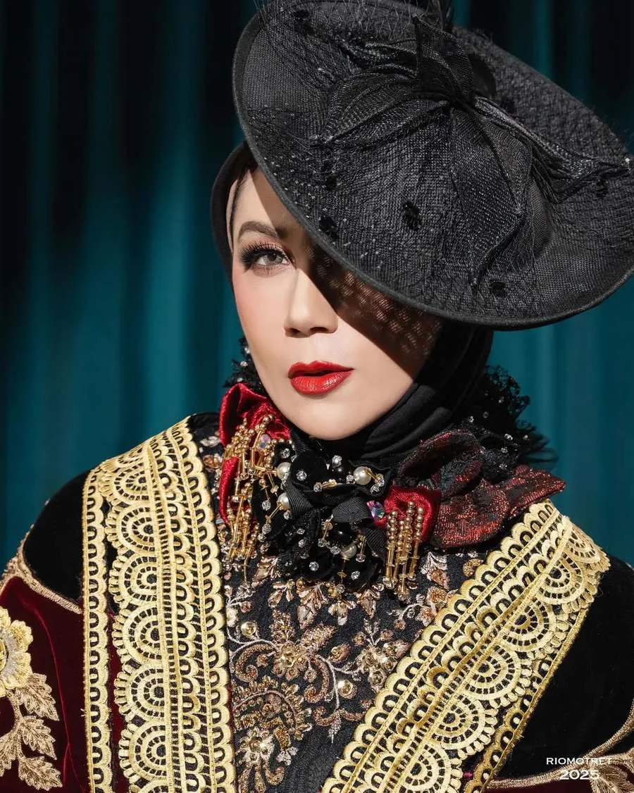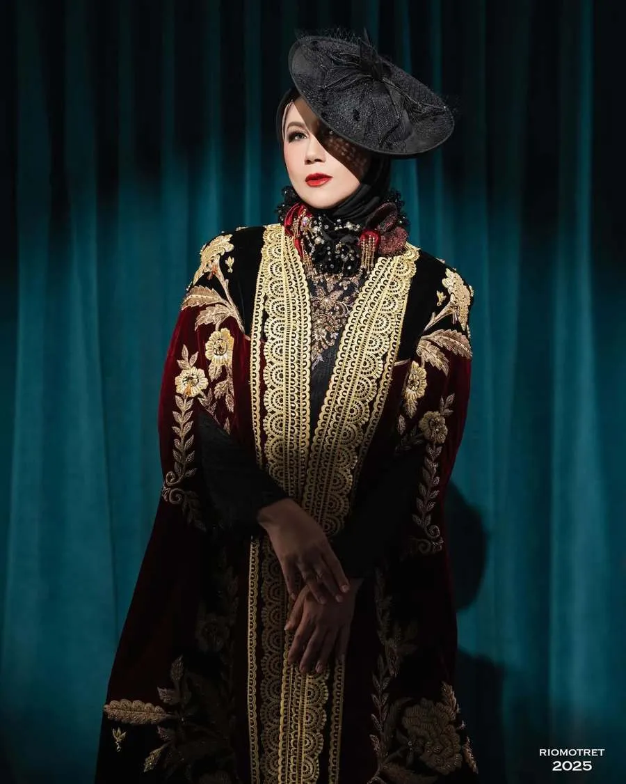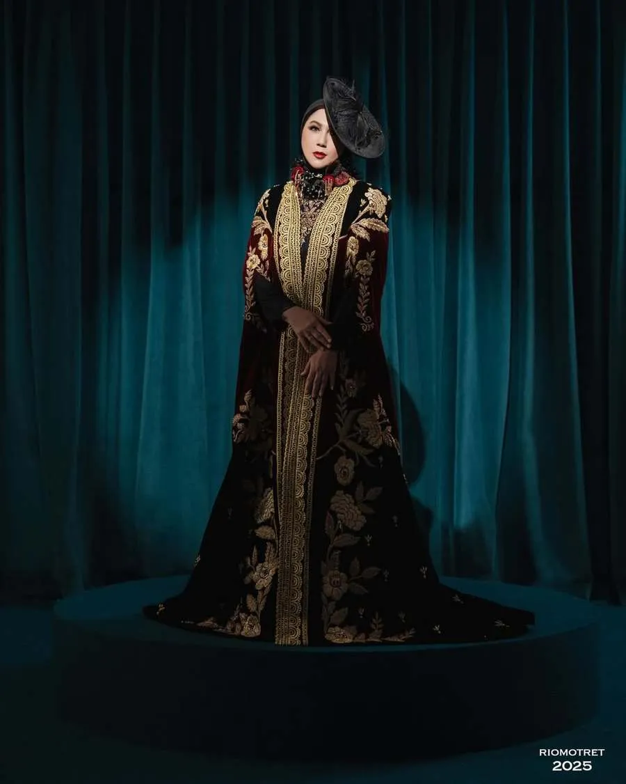 Marini kenakan jubah panjang penuh motif klasik. Penampilannya dipermanis oleh sebuah topi bundar. Gayanya mirip bangsawan Eropa.