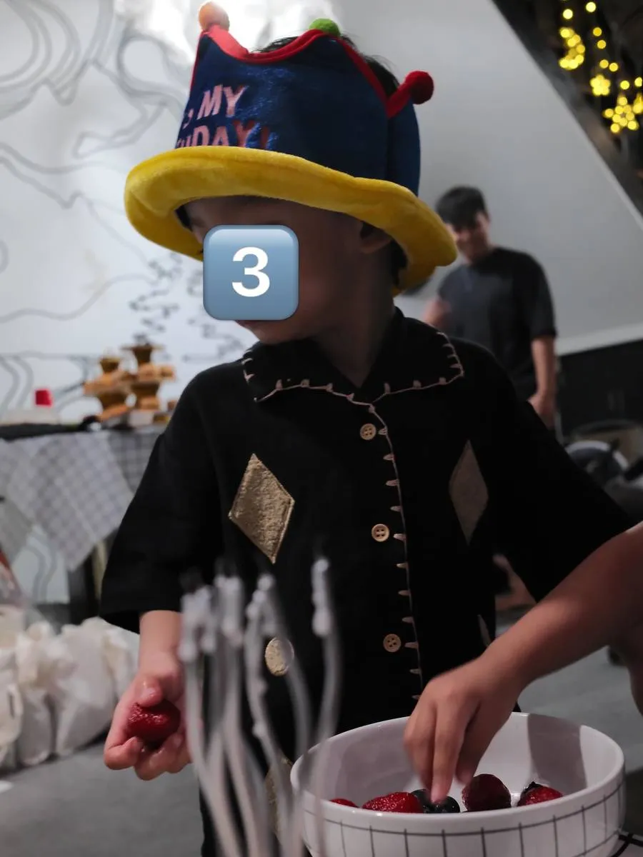 Arthura terlihat sangat lucu dan menggemaskan saat tampil di acara pesta ulang tahunnya. Penampilan Arthura tetap mencuri perhatian meskipun wajahnya sengaja ditutupi oleh stiker.