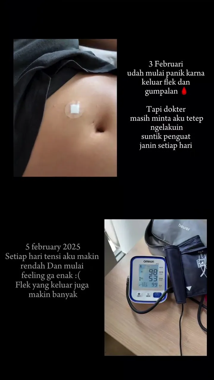 Beberapa hari kemudian, Adinda Thomas mulai mengalami flek dan gumpalan darah yang membuatnya panik. Meski begitu, dokter tetap menyarankan suntik penguat janin setiap hari.