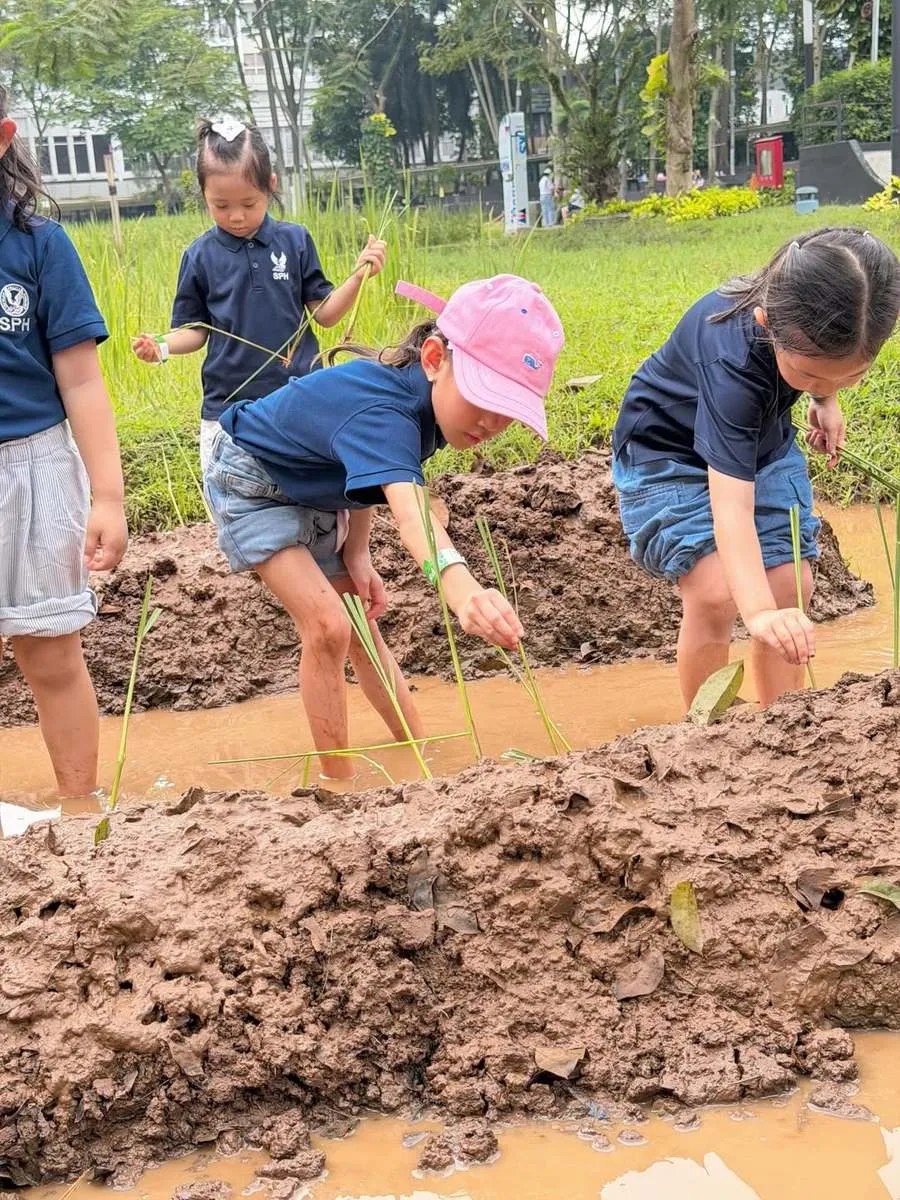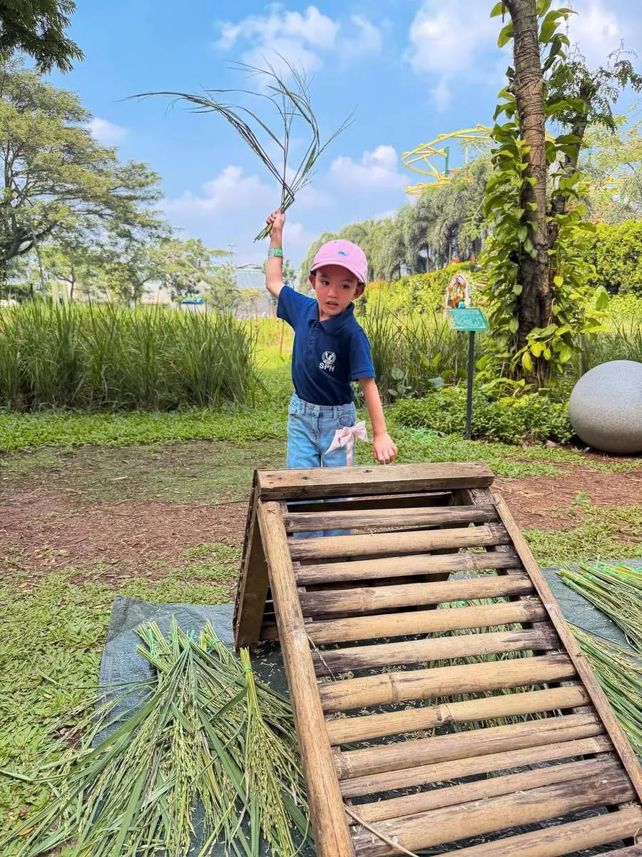 Selain menanam, Claire juga belajar tentang proses memanen padi. Ia sempat mencoba memisahkan bulir padi dari jerami menggunakan alat tradisional.