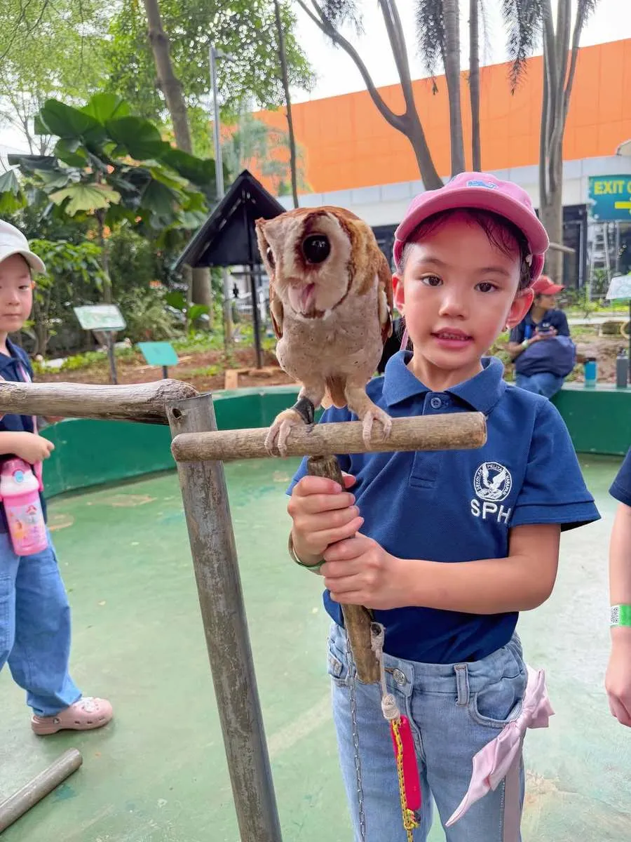 Momen tersebut juga semakin kaya akan pengalaman dengan mengenal binatang. Ya, Claire tampak berani mendekat seekor burung hantu.