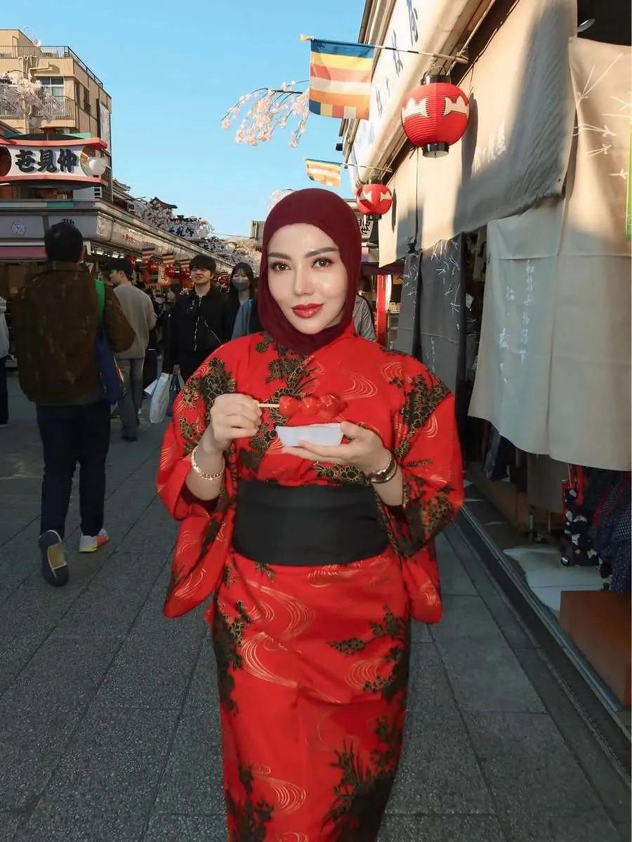 Selama di Jepang, ia melakukan berbagai aktivitas seru salah satunya mencoba tampil kenakan kimono. Bella memilih kimono berwarna merah.